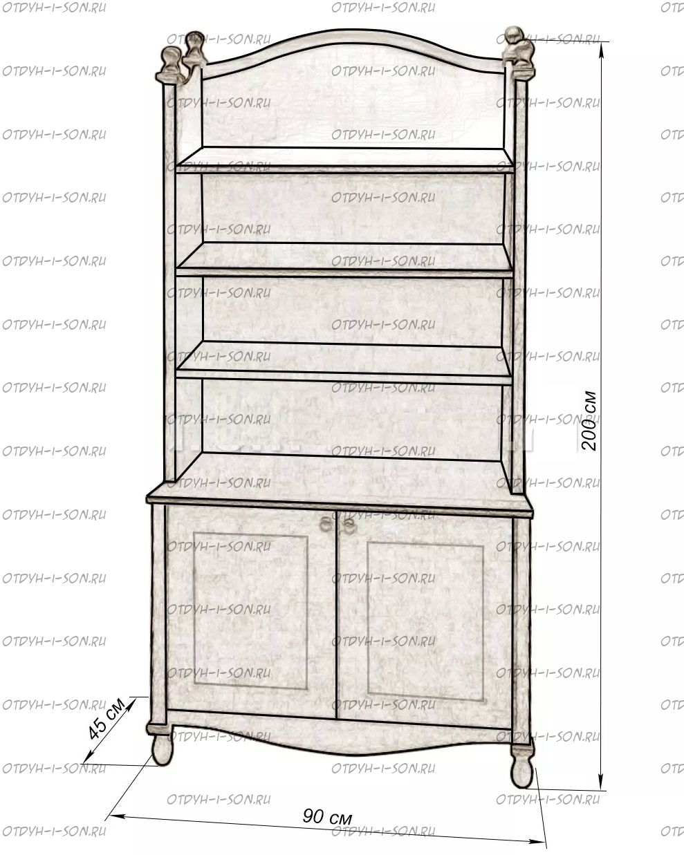 Буфет Вероника Характеристики: Внешние габариты (ШхГхВ): 900х400х2000 мм. Материал: массив дерева Цвета: венге 1, венге 2, венге 3, венге 4, венге тон 2, коричневый тон 2, коричневый 1, коричневый 2, коричневый 3, коричневый 4, красно-коричневый тон 2, красно-коричневый 1, красно-коричневый 2, красно-коричневый 3, красно-коричневый 4, лак Изготовление в белом цвете, фисташковый, слоновая кость плюс 25%