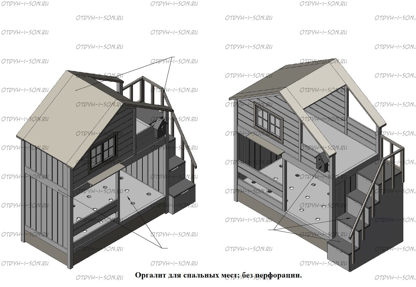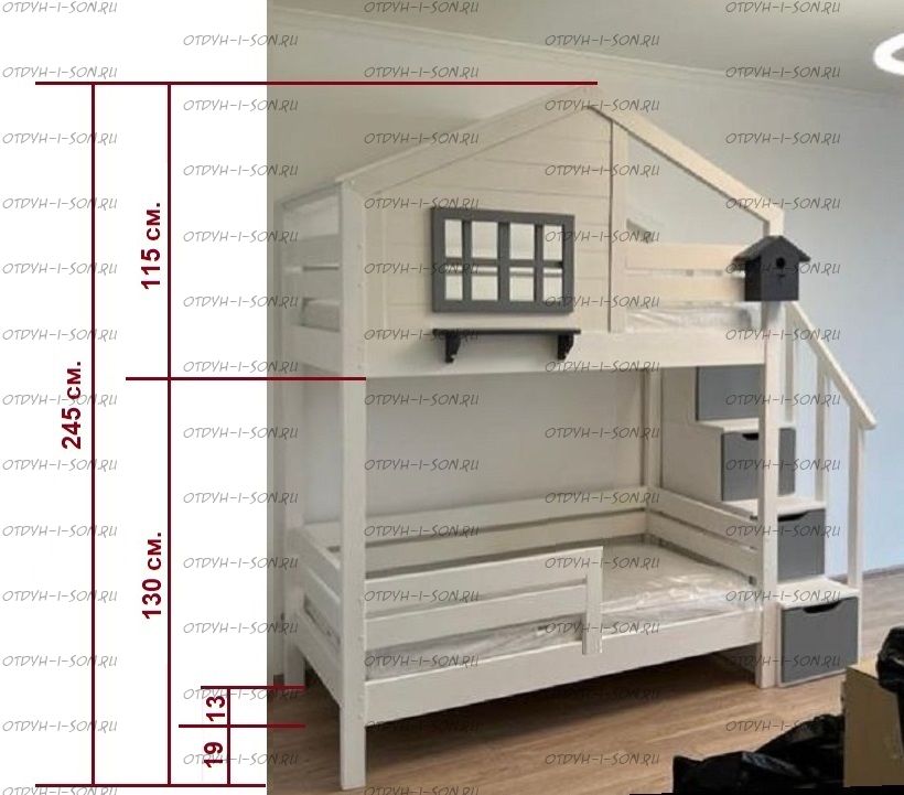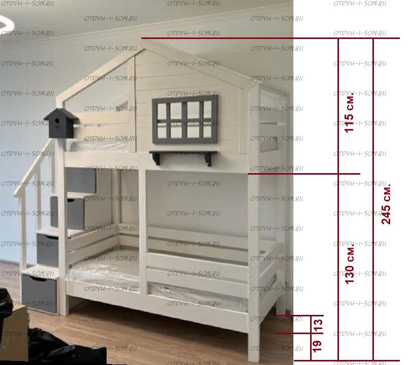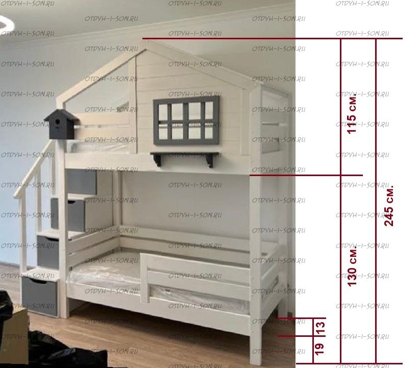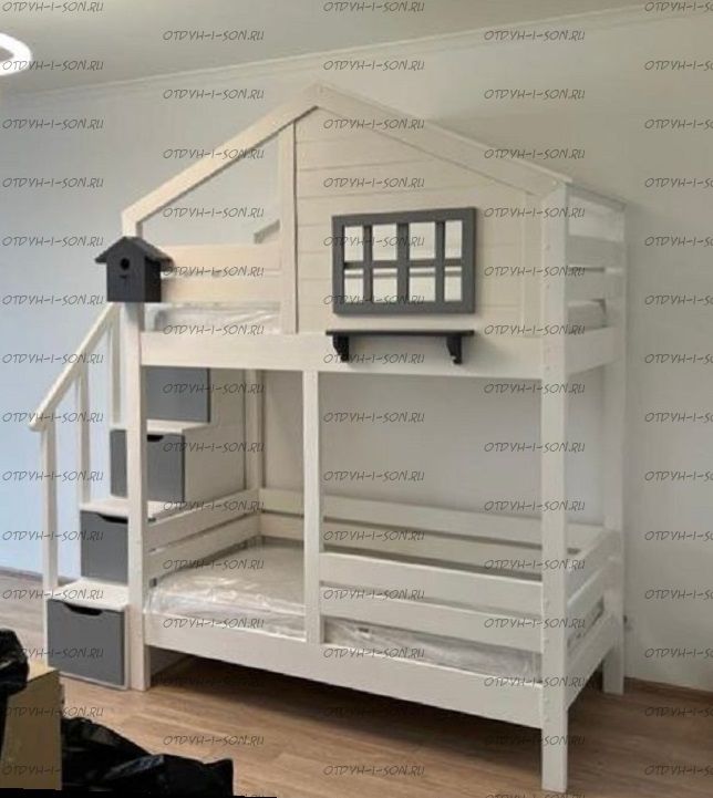 Двухъярусная кровать-домик Roof №8А Характеристики: кровать изготавливается из массива сосны, размер спальных мест по желанию, цвет возможен по желанию. Стоимость кровати расчетная