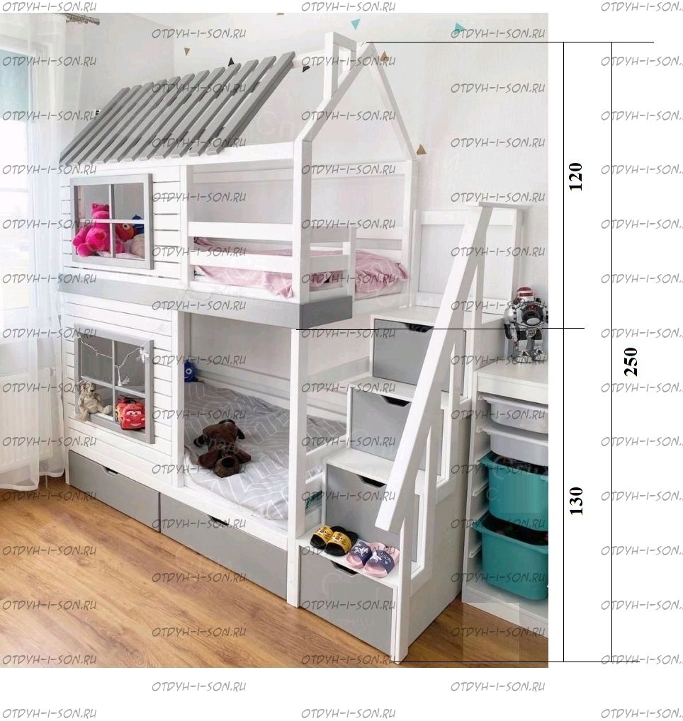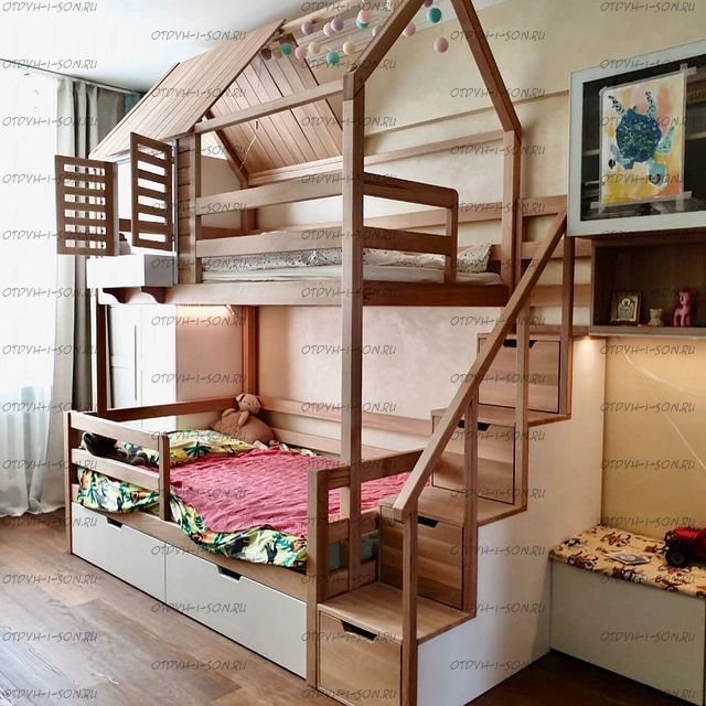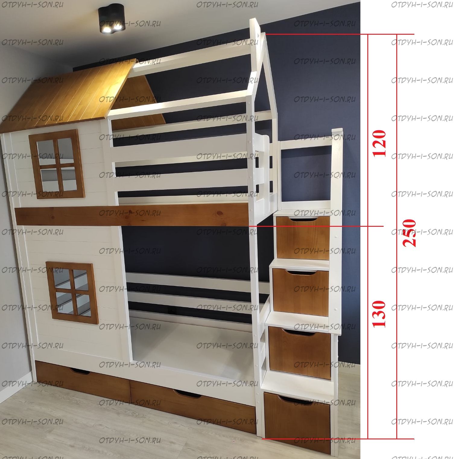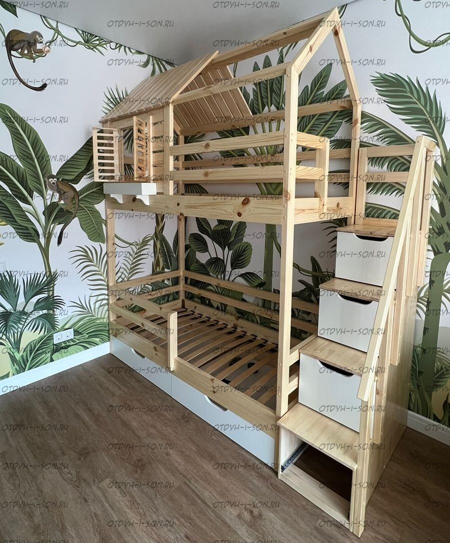 Двухъярусная кровать домик Standard №47 New York Комплектация: Кровать двухъярусная Домик Ящики подкроватные Лестница-тумба Характеристики: •Размеры верхнего спального места: 80х160 см.,90х180 см.,90х200 см.и любые другие •Размеры нижнего спального места: 80х160 см.,90х180 см.,90х200 см.и любые другие •Внешние размеры кровати при размере спального места 90х200 (ШхГхВ): •Внешние размеры кровати с лестницей-комодом сп.место 90х200 (ШхГхВ): •Габаритные размеры: любые •Материалы: массив сосны •Цвет покрытия: любая цветовая гамма (таблица палитры Ral); покраска в стандартный цвет под дерево) 10% Покраска в эмаль 20%