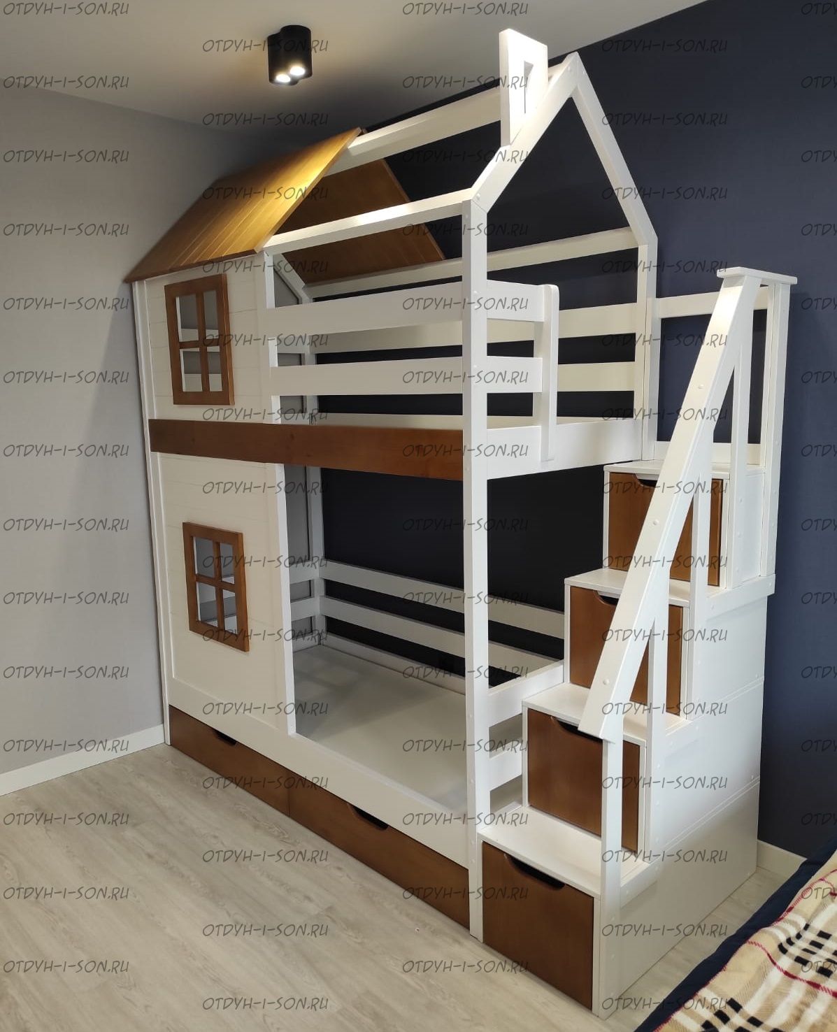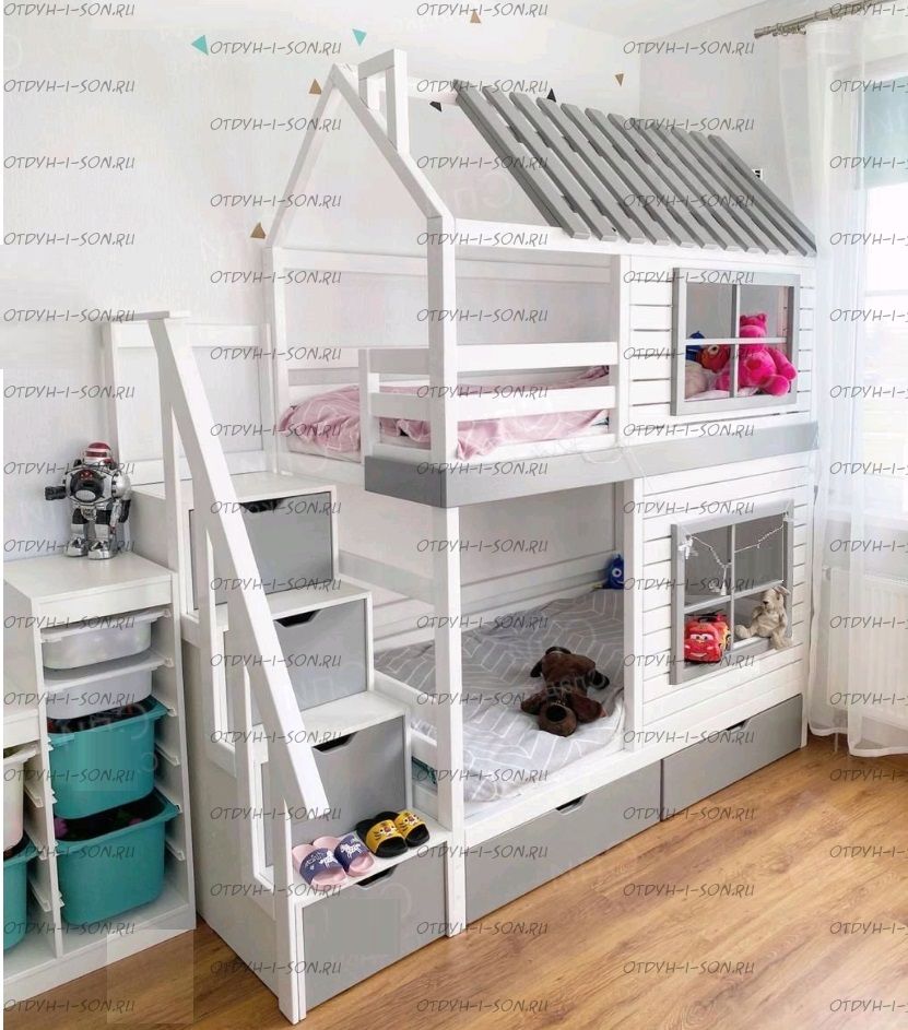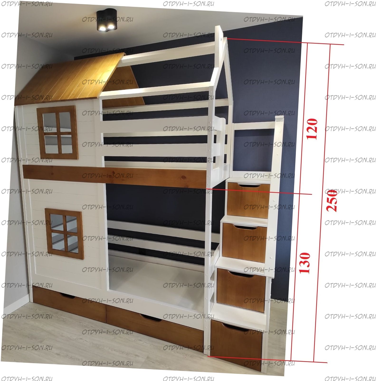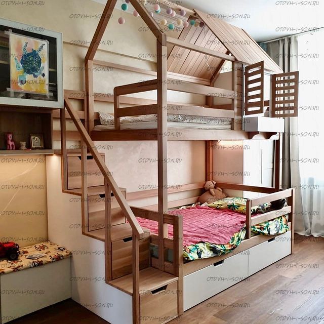 Двухъярусная кровать домик Standard №47 New York Комплектация: Кровать двухъярусная Домик Ящики подкроватные Лестница-тумба Характеристики: •Размеры верхнего спального места: 80х160 см.,90х180 см.,90х200 см.и любые другие •Размеры нижнего спального места: 80х160 см.,90х180 см.,90х200 см.и любые другие •Внешние размеры кровати при размере спального места 90х200 (ШхГхВ): •Внешние размеры кровати с лестницей-комодом сп.место 90х200 (ШхГхВ): •Габаритные размеры: любые •Материалы: массив сосны •Цвет покрытия: любая цветовая гамма (таблица палитры Ral); покраска в стандартный цвет под дерево) 10% Покраска в эмаль 20%