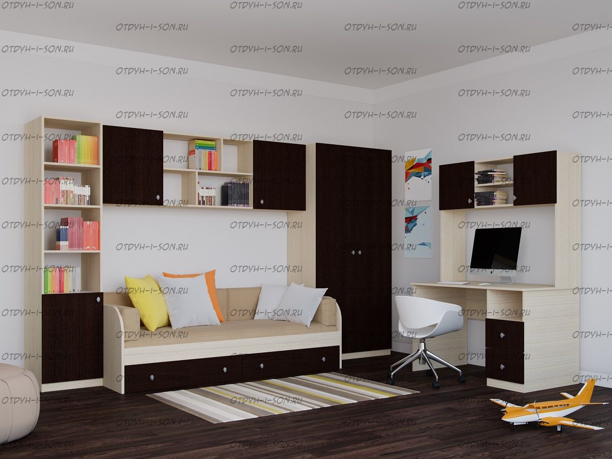 Детская комната Астра №2 Комплектация: Шкаф 2-дверный Астра 45 (ШхГхВ): 900х450х2000 мм. Стол письменный Астра (ШхГхВ): 1200х650х750 мм. Надстройка стола Астра (ШхГхВ): 1200х300х1000 мм. Пенал закрытый Астра 1/3 (ШхГхВ): 450х450х2000 мм. Полка навесная Астра (ШхГхВ): 1942х300х600 мм. Кровать Астра (ШхГхВ): 1943х832х550 мм. Характеристики: Цвет корпуса: Дуб молочный Цвет фасада на выбор: Венге, Розовый, Дуб молочный, Орех, Фиолетовый, Дуб шамони, Голубой, Оранжевый, Салатовый, Дуб молочный
