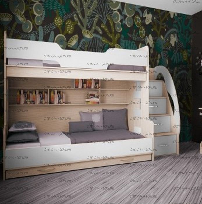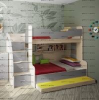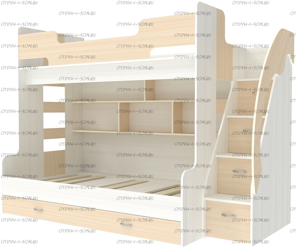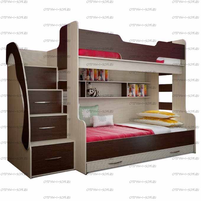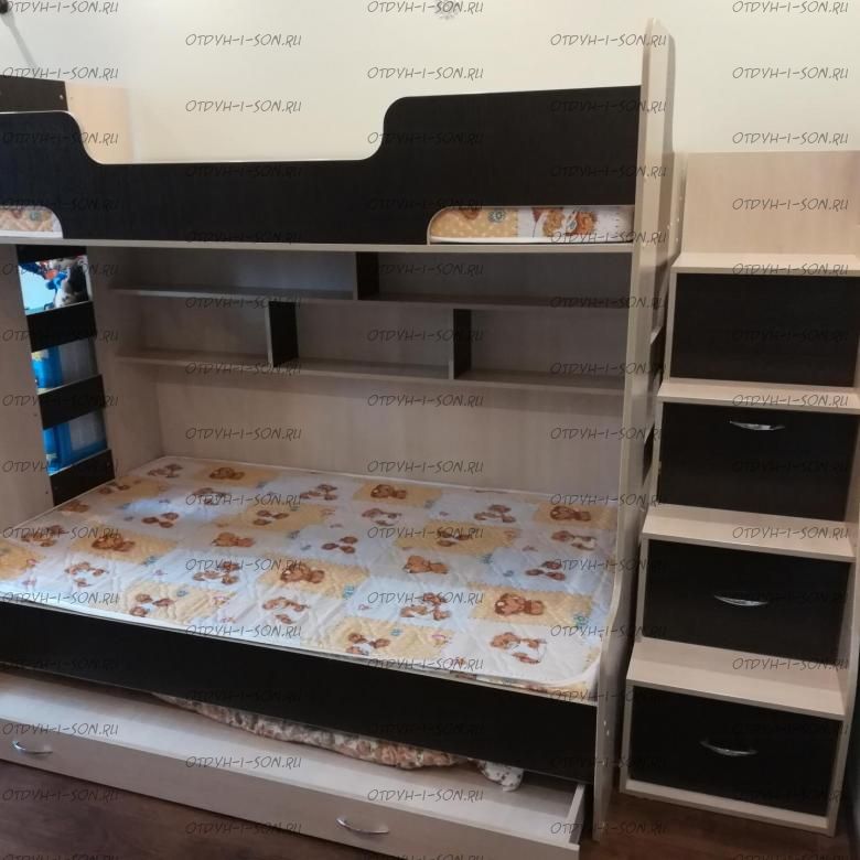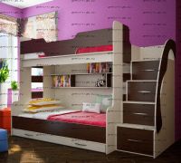 Тумба-лестница является частью конструкции и предназначена не только для подъема на второй ярус, но и для хранения детских вещей и игрушек. Глубина верхней ступени 39 см, с 1 по 3 ступень глубина 21,2см, ширина 46,6см. В ней два нижних ящика выдвижные, третий снизу - откидной, верхний - глухой. Под верхним спальным местом есть две полки. Цвета на выбор.
