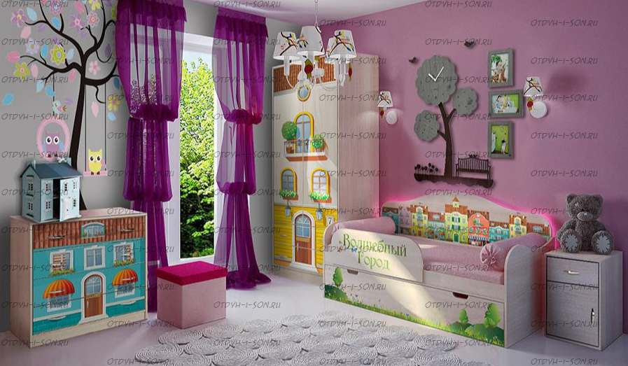 Детская комната Волшебный Город №2 Комплектация: Кровать Волшебный Город арт. 40022 (70х160) Шкаф 2-дверный Волшебный Город ВГ-13/3 (ШхГхВ): 750х520х2000 мм. Комод Волшебный Город ВГ-13/5 (ШхГхВ): 820х435х870 мм. Бортик с вашим именем Волшебный Город ВГ-13/17 Характеристики: Размер спального места: 70х160 см. Материал: ЛДСП 16 мм (Австрия, Egger). Цвет корпуса/фасада: Дуб Млечный/фотопечать
