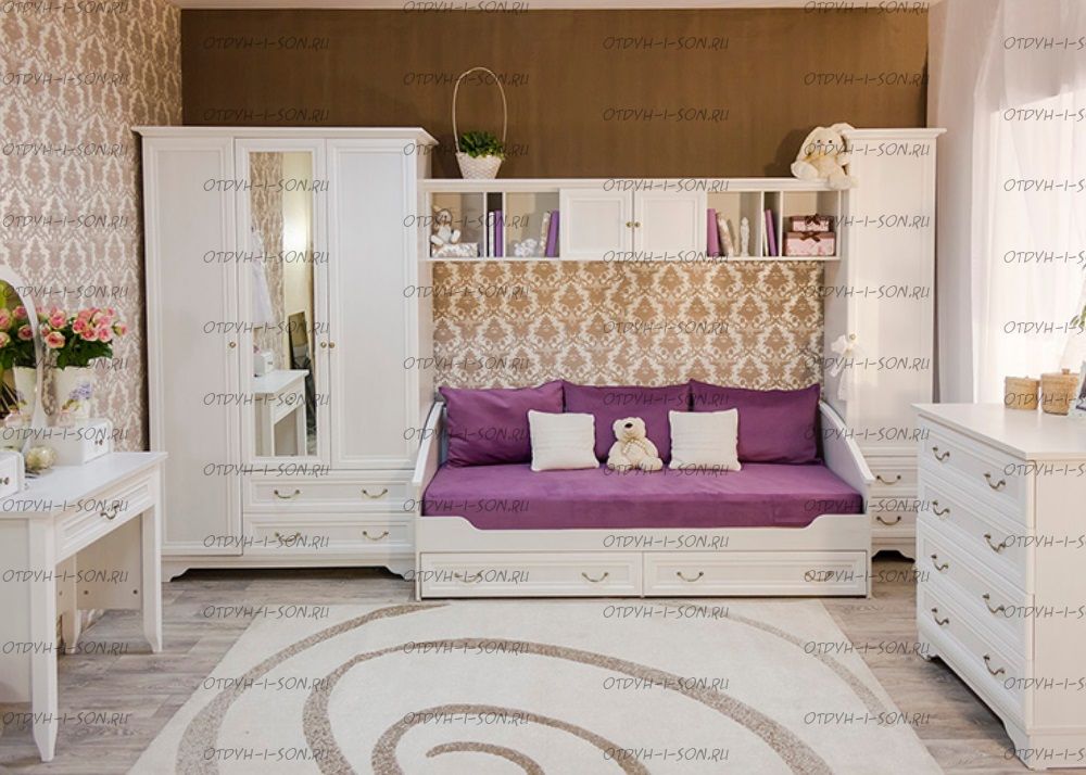 Детская комната Классика №2 Комплектация: Кровать Классика Шкаф 3-дверный Классика Полка длинная Классика Шкаф-пенал Классика Комод Классика Зеркало Классика Стол туалетный Классика Характеристики: Размер спального места: 80х190, 90х190 см. Материалы: ЛДСП, МДФ, кромка ПВХ. Цвет корпуса/фасада: Рамух белый