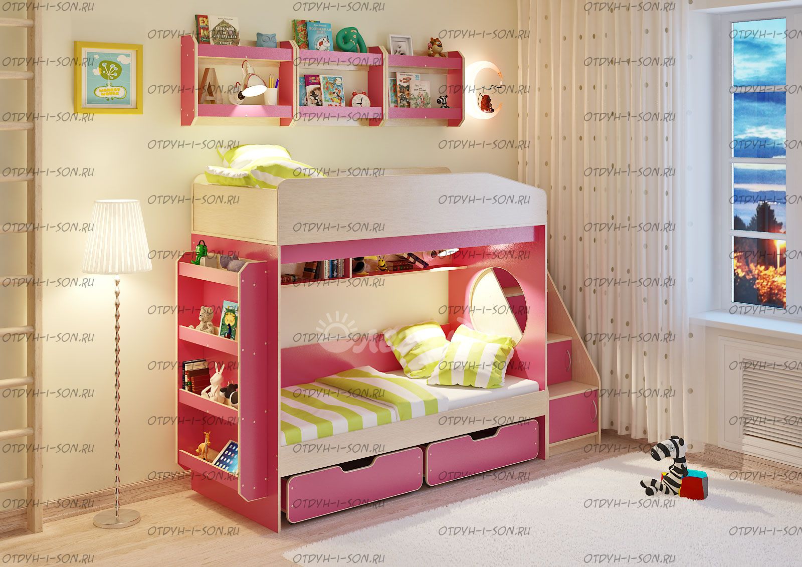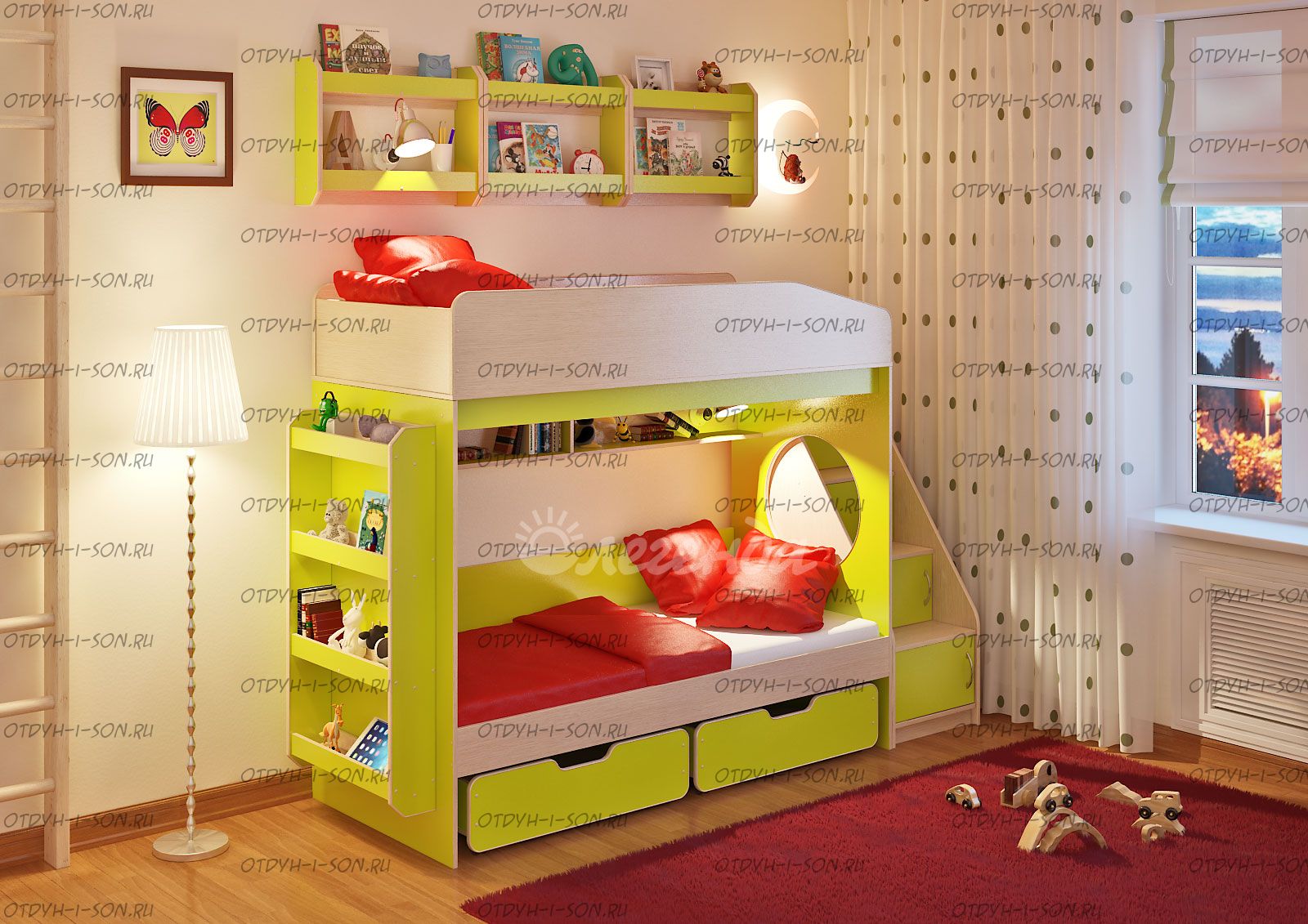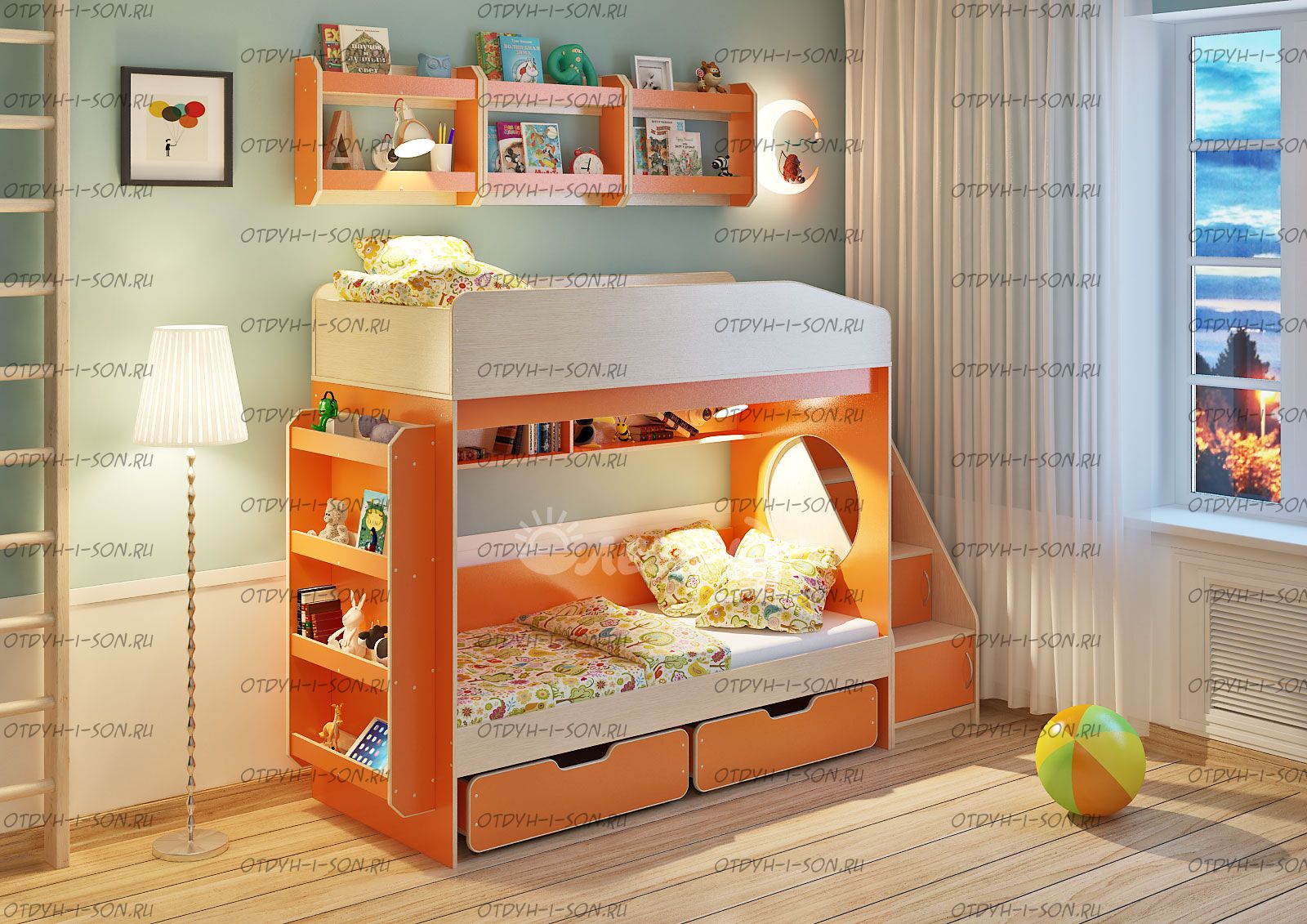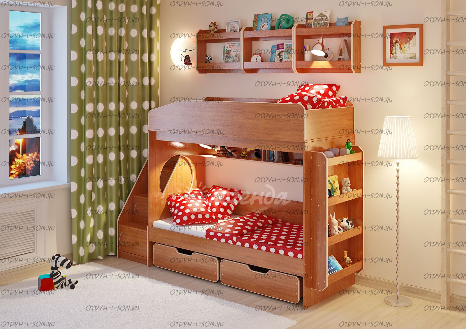 Детская комната Сказка-10.1 Комплектация: Кровать двухъярусная Легенда-10 - 80х180 и 80Х180 см. Лестница угловая ЛУ-10 Дверцы к полкам лестницы Фасады ЛУ-10 Ящик выкатной Л-01 - 2 шт., габариты каждого ящика (Ш*Г*В) 840*584*236 мм. Полка Л-02 - 3 шт. Полка Л-04 Характеристики: Спальное место: 80Х180см. Внешние габариты: Глубина ступенек 23 см. Глубина нижней ступеньки-18 см. Вес: 217,5 кг. Объем: 0,5 м3 Рекомендуемая высота матраса: 5-15см