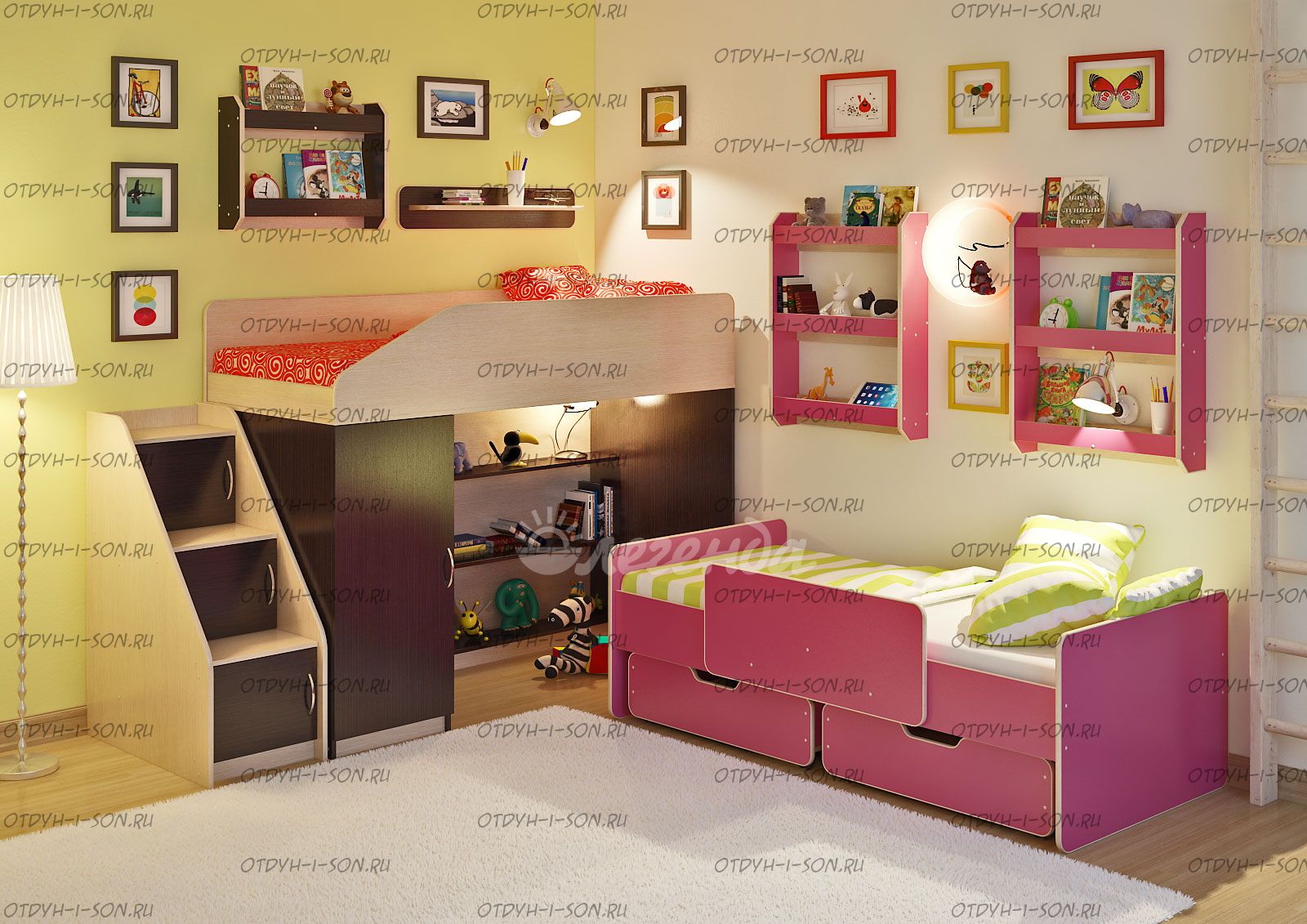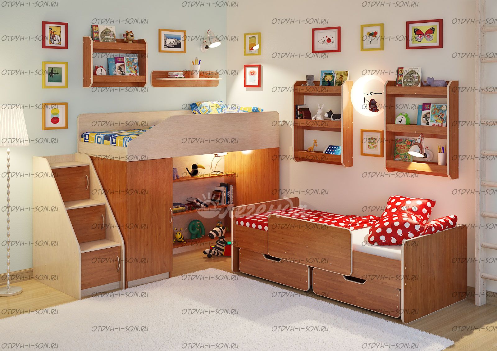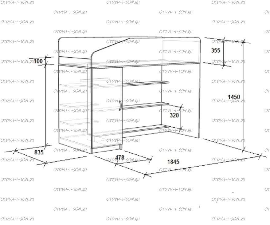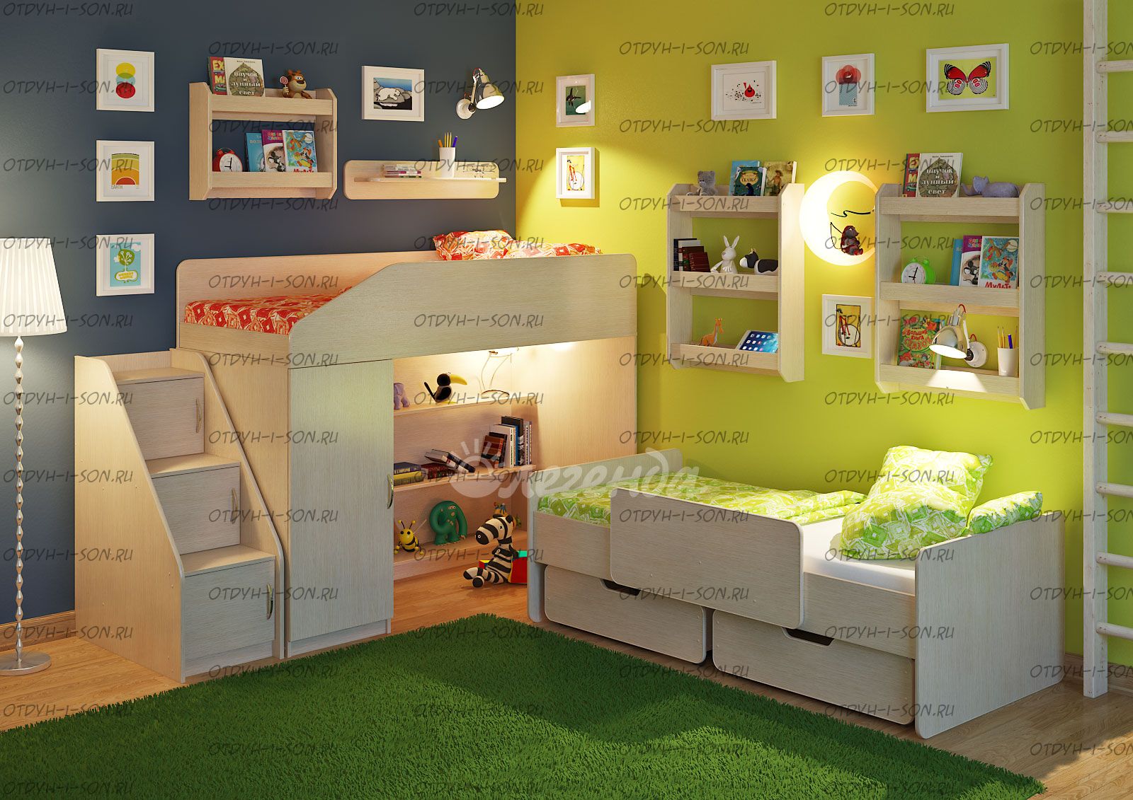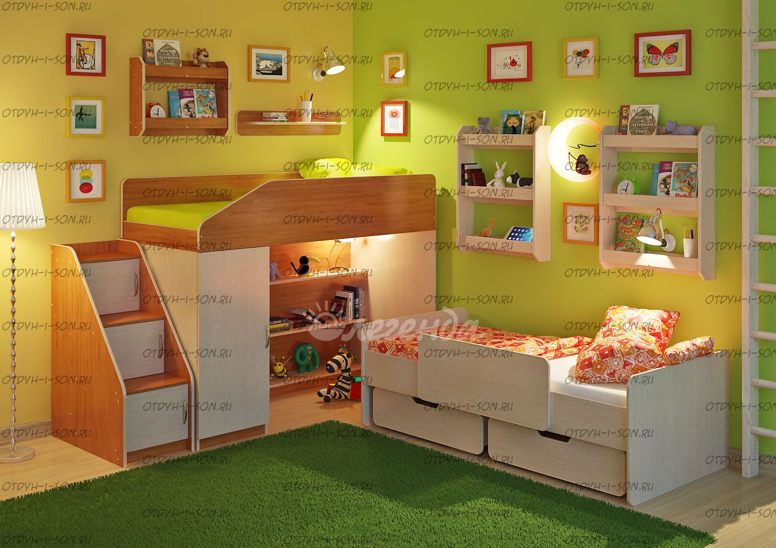 Детская комната Легенда-11.1. Характеристики: габариты кровати чердака: 2275×834×1450 габариты малой кровати: 1842×900×600 Спальное Место, кровать чердак Легенда 11.5: 80Х180 Спальное Место, детская кровать Легенда 14.1: 80Х180 Комплектация: кровать чердак Легенда 11, 1845×834×1450 лестница угловая ЛУ-11, 430×815×1075 Дверцы к полкам лестницы фасады ЛУ-10, 388×254×16 кровать детская Легенда 14, 1842×900×600 ящик выкатной Л-01(2шт), 840×600×222 полка Л-01, 800×156×140 полка Л-02, 626×150×476 полка Л-03 (2шт), 626×150×800