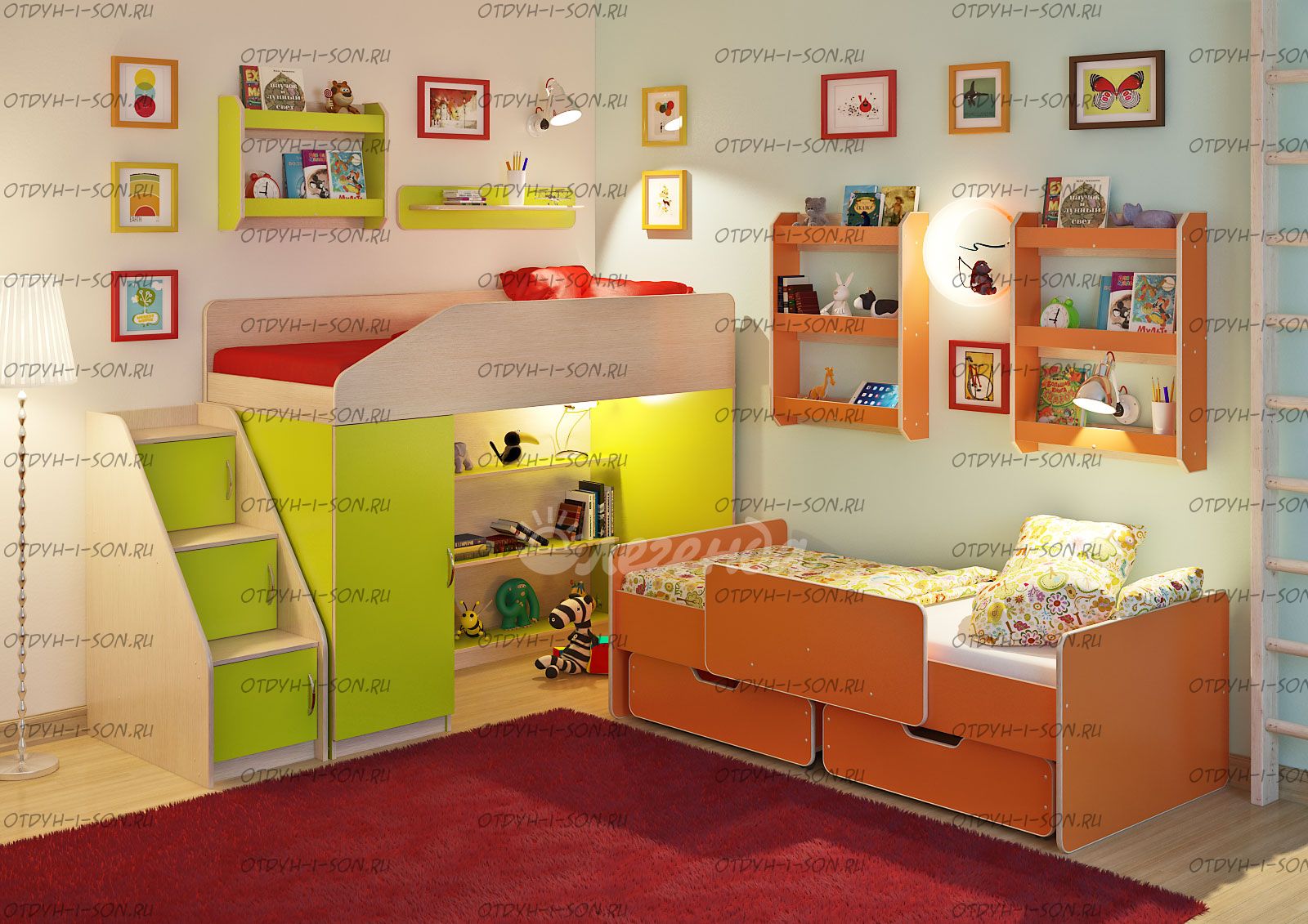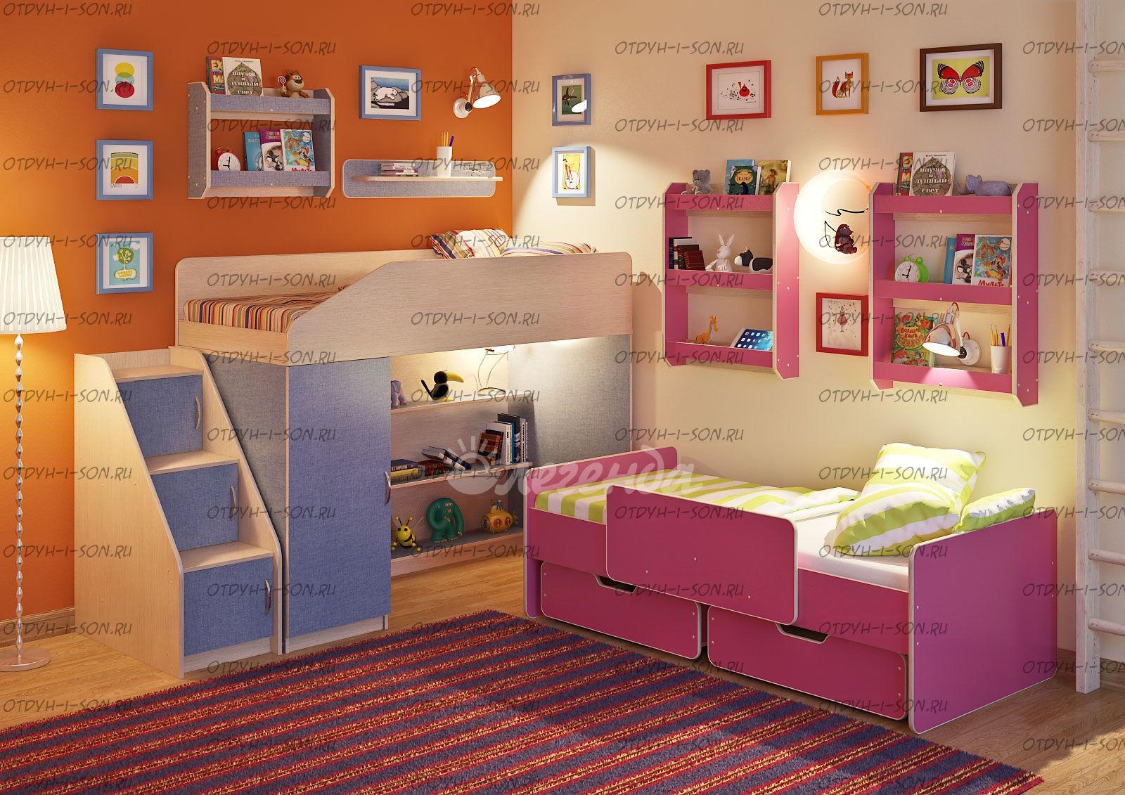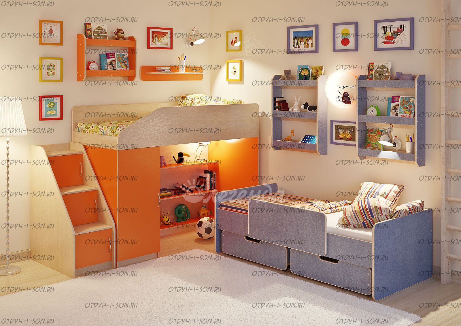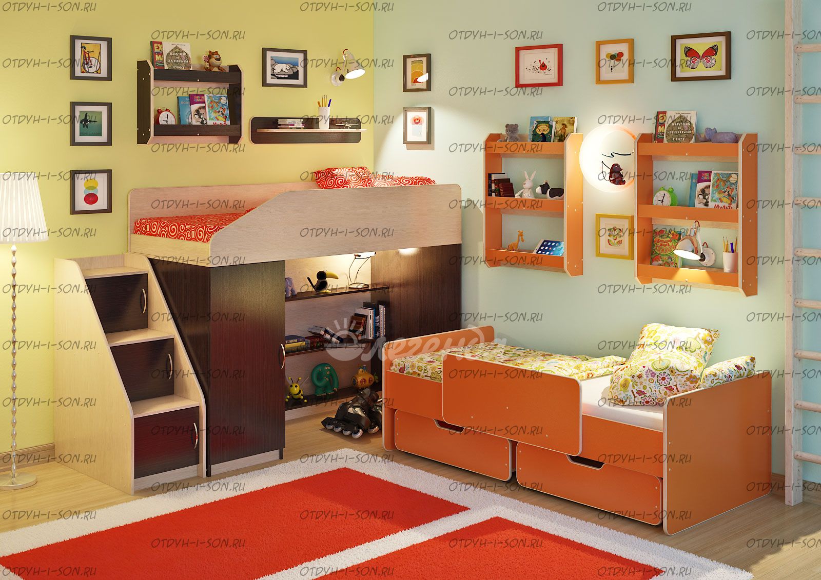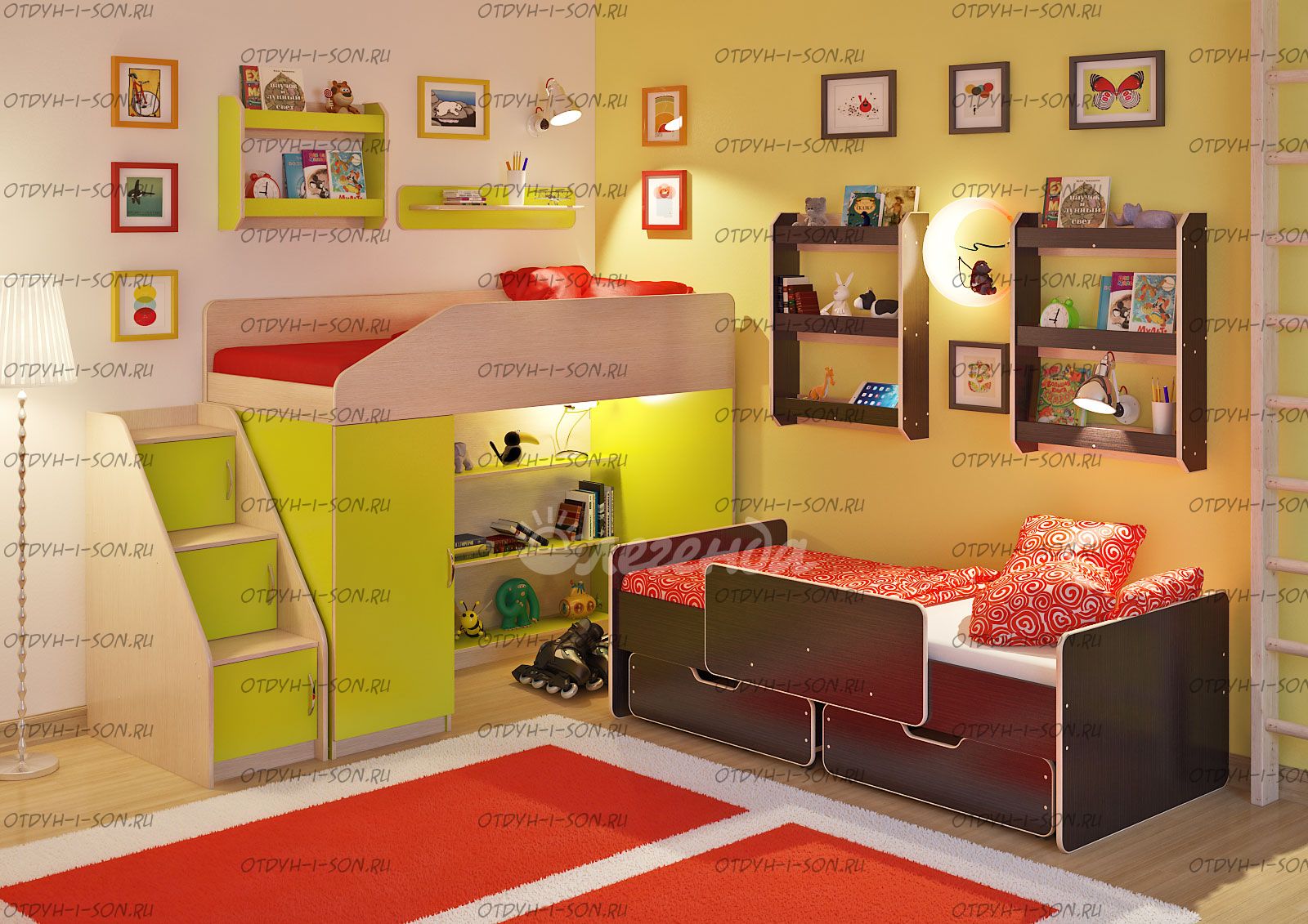 Детская комната Легенда-11.1. Характеристики: габариты кровати чердака: 2275×834×1450 габариты малой кровати: 1842×900×600 Спальное Место, кровать чердак Легенда 11.5: 80Х180 Спальное Место, детская кровать Легенда 14.1: 80Х180 Комплектация: кровать чердак Легенда 11, 1845×834×1450 лестница угловая ЛУ-11, 430×815×1075 Дверцы к полкам лестницы фасады ЛУ-10, 388×254×16 кровать детская Легенда 14, 1842×900×600 ящик выкатной Л-01(2шт), 840×600×222 полка Л-01, 800×156×140 полка Л-02, 626×150×476 полка Л-03 (2шт), 626×150×800