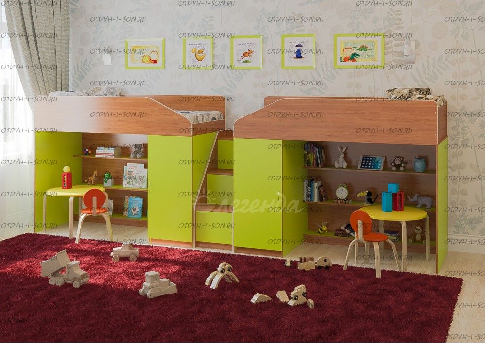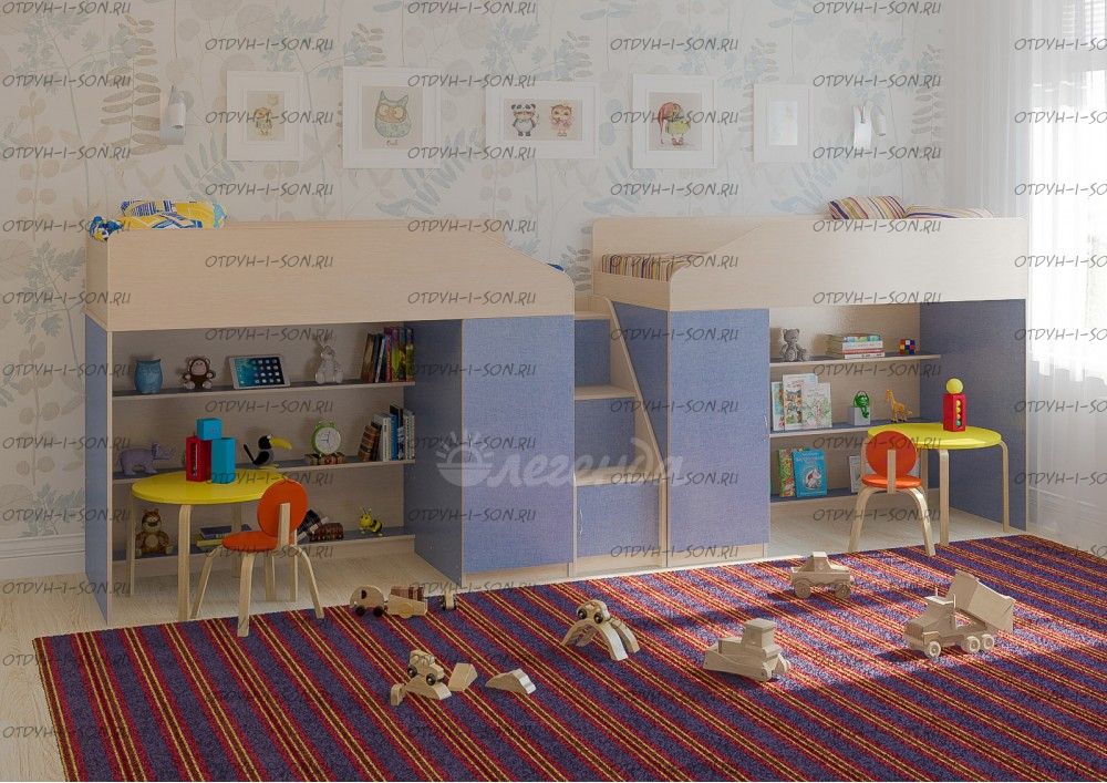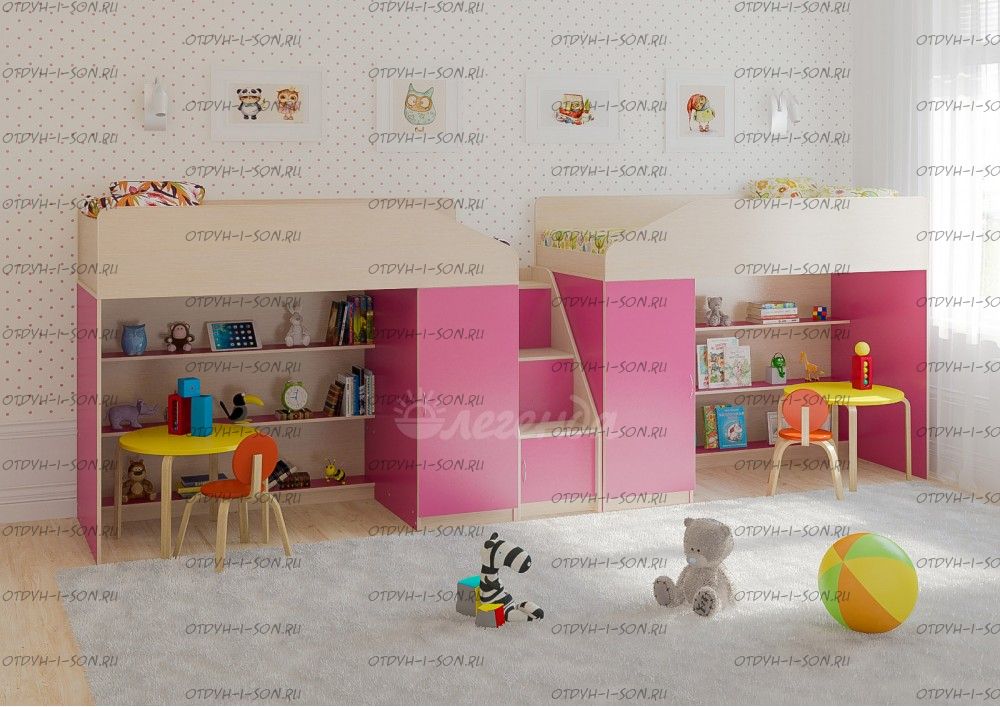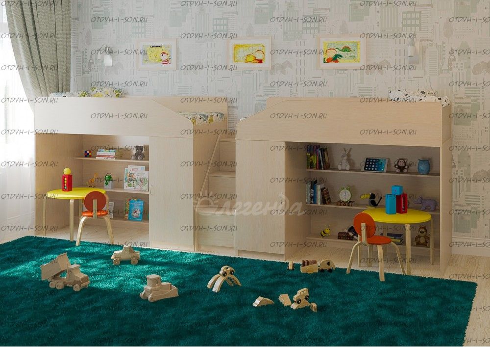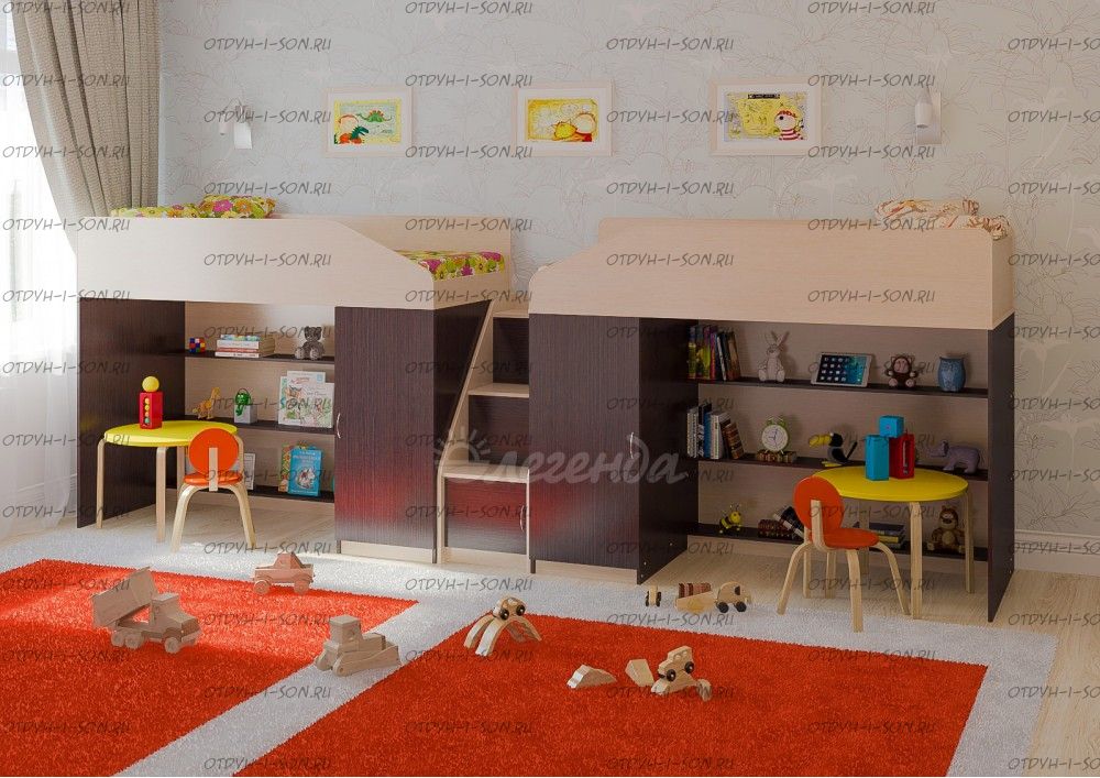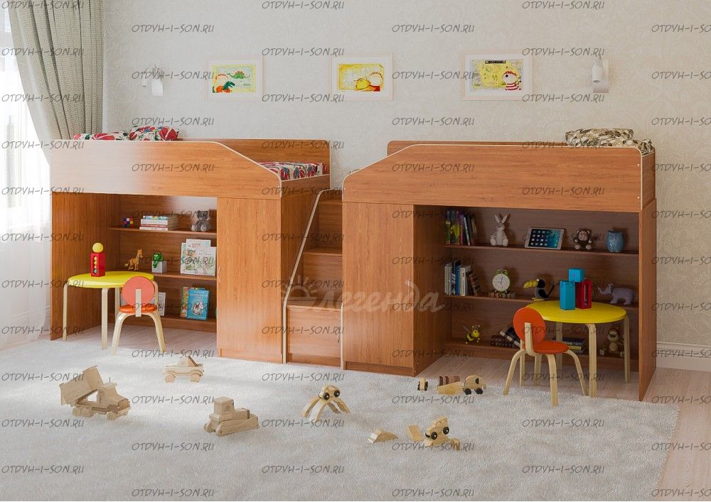 Детская комната Легенда-11.8 Характеристики: Размер: 80Х180 + 80х180 см. Внешние габариты (ШхДхВ): Корпус : ЛДСП, 16 мм. Высота изголовья: по запросу Высота изножья: по запросу Высота днища: по запросу Высота бортика: 30 см. Нестандарт: нет Вес: Объем: Цвет корпуса: ольха, венге светлый Цвет фасада: венге светлый, ольха, венге темный, голубой, оранжевый, розовый, лайм Предоплата: нет Комплектация: Кровать-чердак Л-11 (со шкафом и стеллажом) (ШхГхВ): 1845×834×1450 мм. - 2 шт. Лестница угловая ЛУ-11 (ШхГхВ): 430×815×1075 мм. Дверцы к полкам лестницы Фасады ЛУ-11