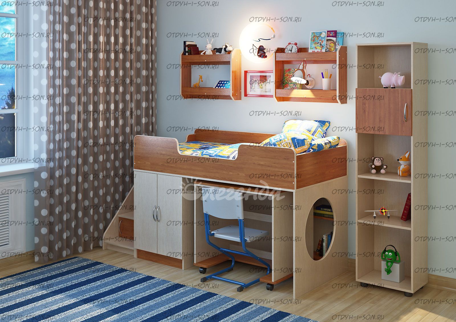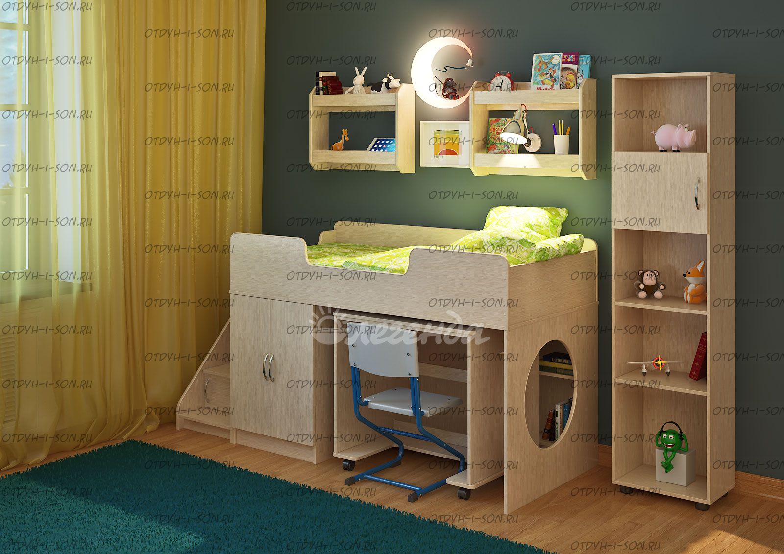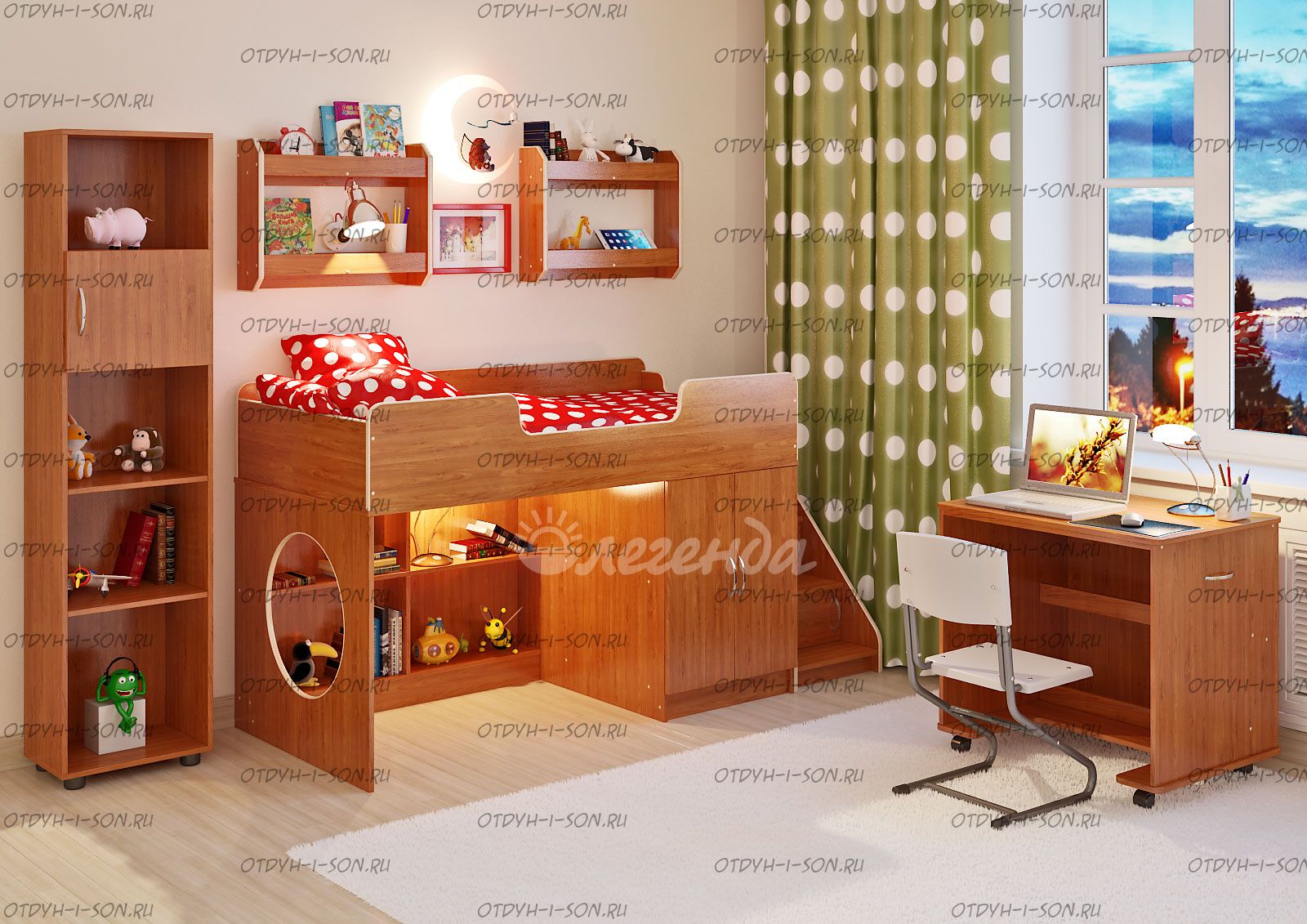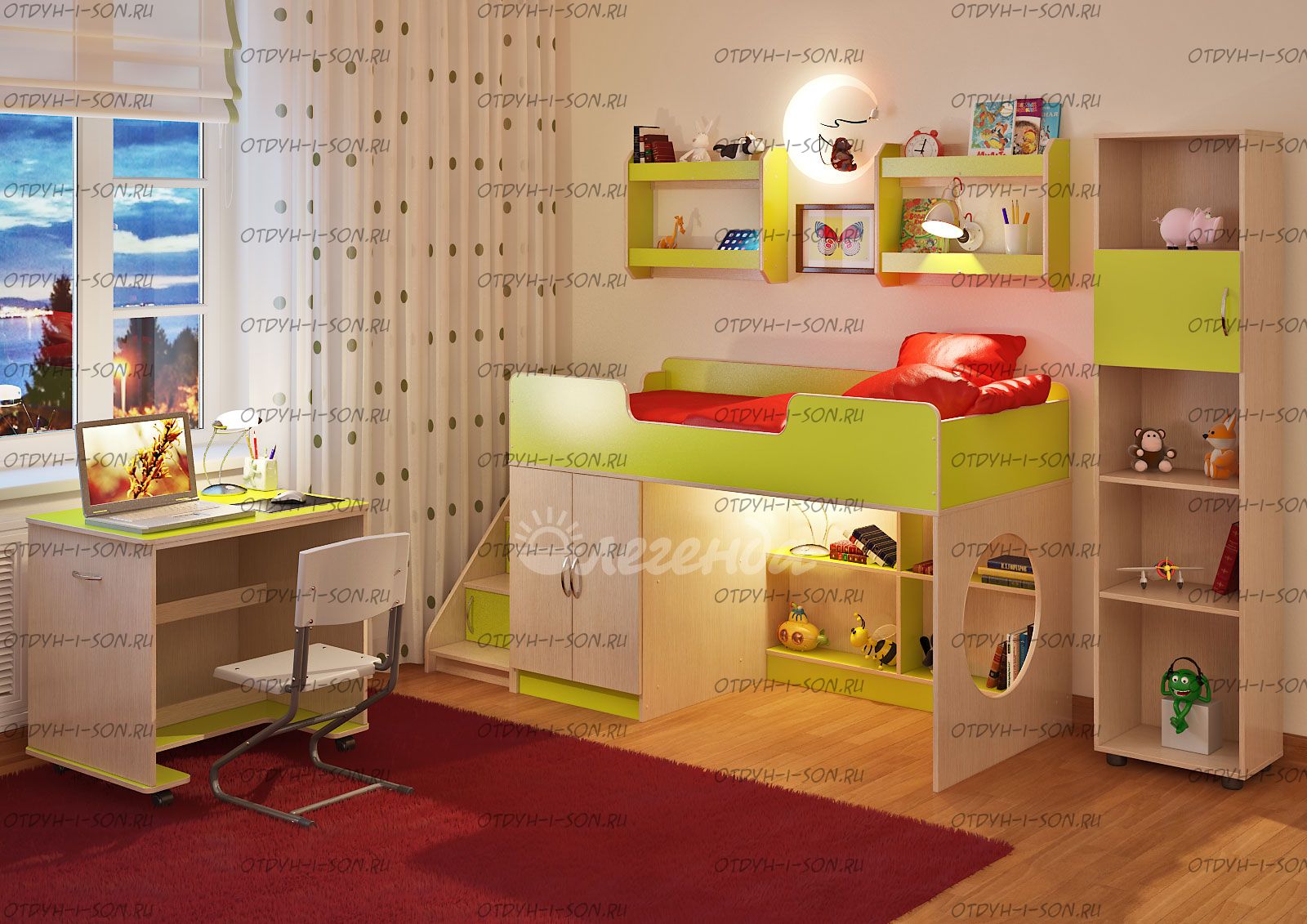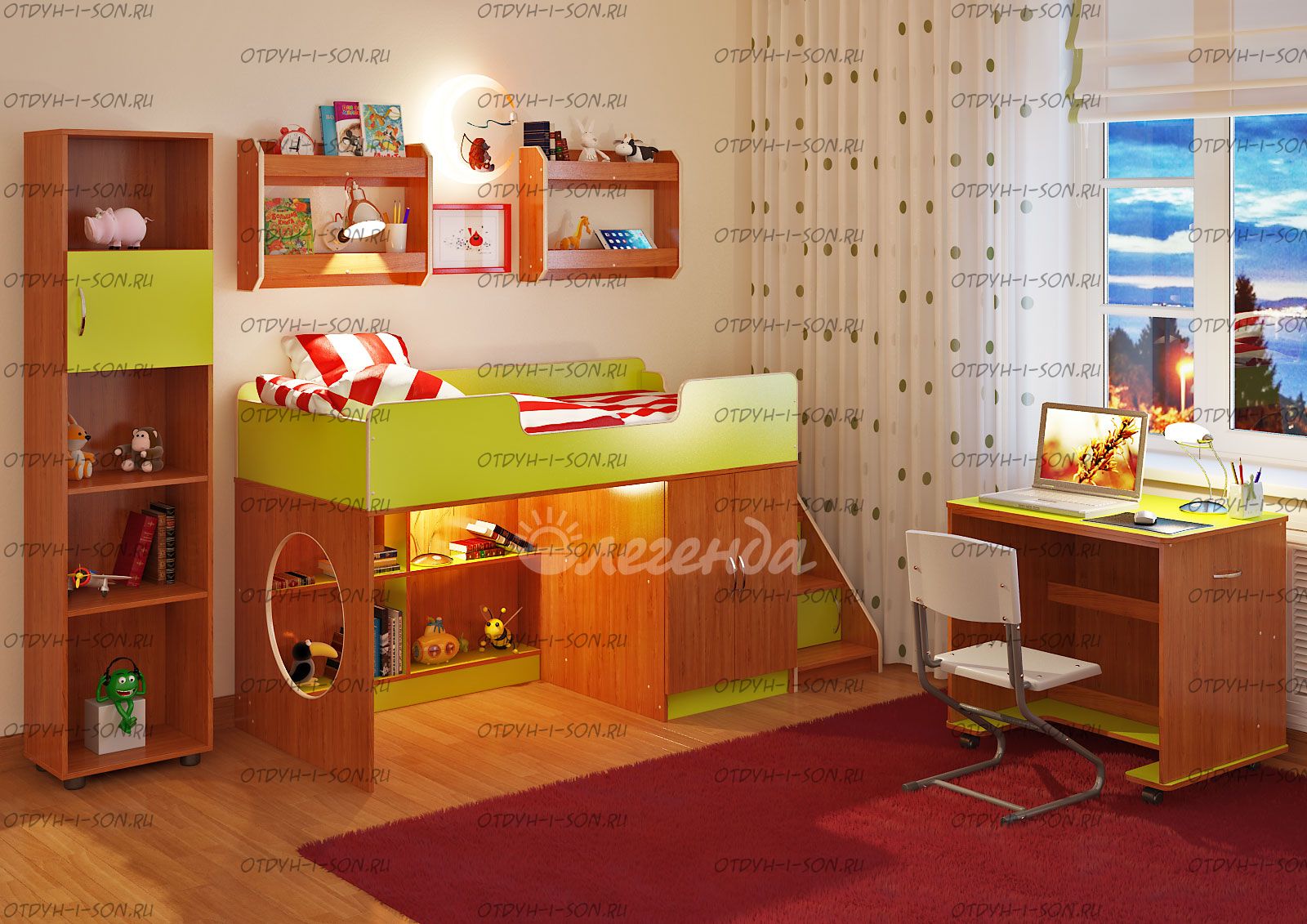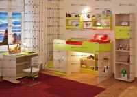 Детская комната Легенда-2.11 Комплеткация: Кровать детская Легенда 2 Лестница угловая ЛУ-02 Стол Л-02 Полка Л-02 (2 шт) Стеллаж Л-01 Характеристики: Внешние габариты: Спальное место: 80Х180 см Рекомендуемая высота матраса: 5-15см Лестница: универсfльная, можно установить сбоку или спереди слева или спереди справа кровати. Но необходимо иметь виду, что в "старых" моделях кровати (выпущенных ранее), лестница не универсальная. Мебель универсальная, может быть собрана в лево- или правостороннем варианте Складская программа Вес: 173,7 кг. Объем: 0,4 м3 Все цвета в наличии Цвет корпуса: ольха, венге светлый Цвет фасада: венге светлый, ольха, венге темный, голубой, оранжевый, розовый, лайм