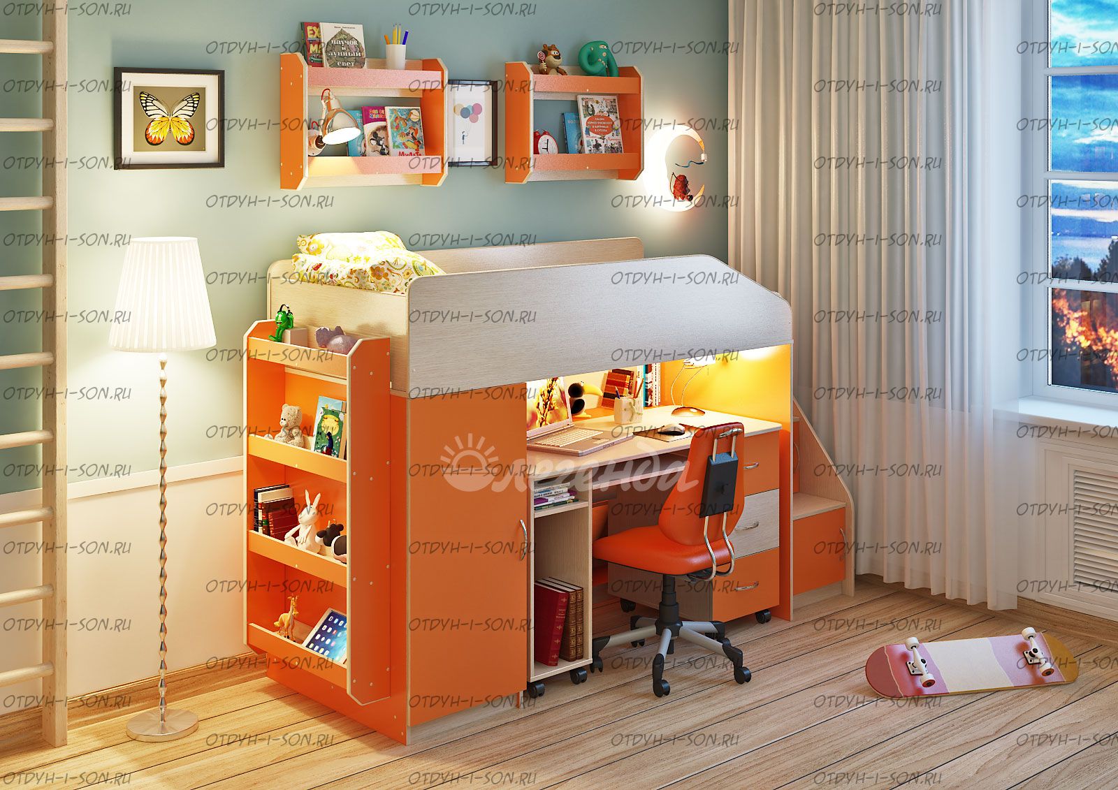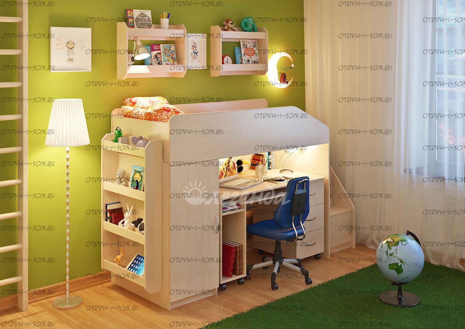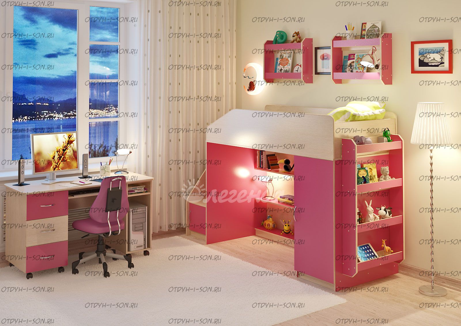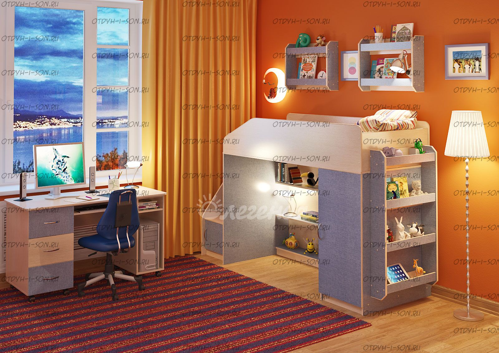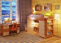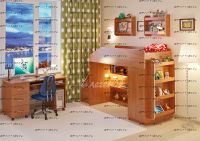 Детская комната Легенда-11.4 Комплектация: кровать чердак Легенда-11 без лестницы, (Д*Ш*В): 1845*834*1450 лестница угловая ЛУ-11, 430×815×1075 стол Л-01, 1315×600×750 Дверцы к полкам лестницы (фасады) ЛУ-11, 388×254×16 полка Л-02 (2 шт), 626×150×476 полка Л-04, 626×150×1126 Характеристики: Спальное место: 80х180 см. Вес: 218,3 кг. Объем: 0,5 м3 Цвет корпуса: ольха, венге светлый Цвет фасада: венге светлый, ольха, венге темный, голубой, оранжевый, розовый, лайм
