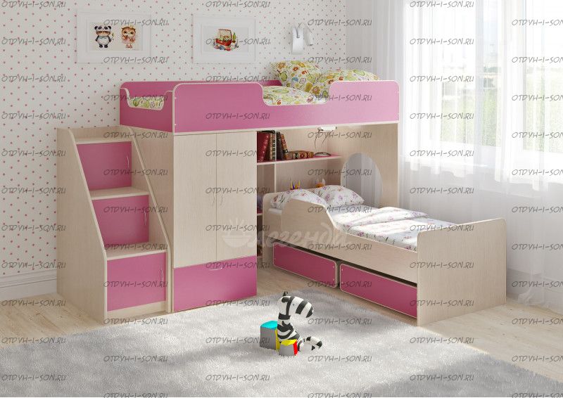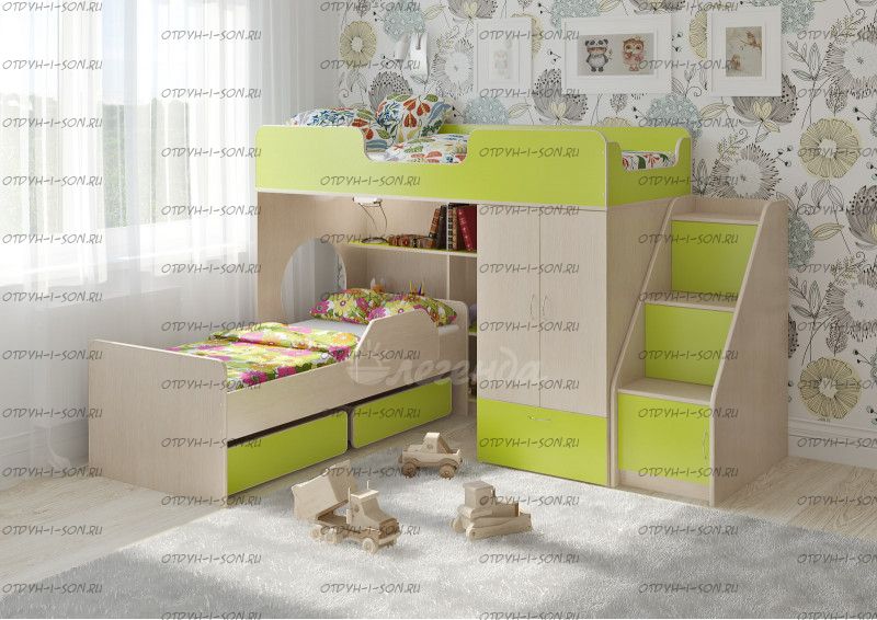 Детская комната Легенда-3.10. Комплектация: Кровать-чердак Легенда -3 Кровать Легенда 27.1 Лестница ЛУ-11 Характеристики: Спальное место: 80Х180см+ 70х160 см Внешние габариты Д*Ш*В : 2278*1838*1395 мм Высота борта: 30см Ширина лестницы: 45см Рекомендуемая высота матраса: 5-15см Мебель универсальная, может быть собрана в лево- или правостороннем варианте Лестница: универсальная, можно установить сбоку или спереди слева или спереди справа кровати. Вес: 170 кг. Объем: 0,44 м3 Кол-во коробок : 12 шт Цвет корпуса: ольха, венге светлый Цвет фасада: венге светлый, ольха, венге темный, голубой, оранжевый, розовый, лайм
