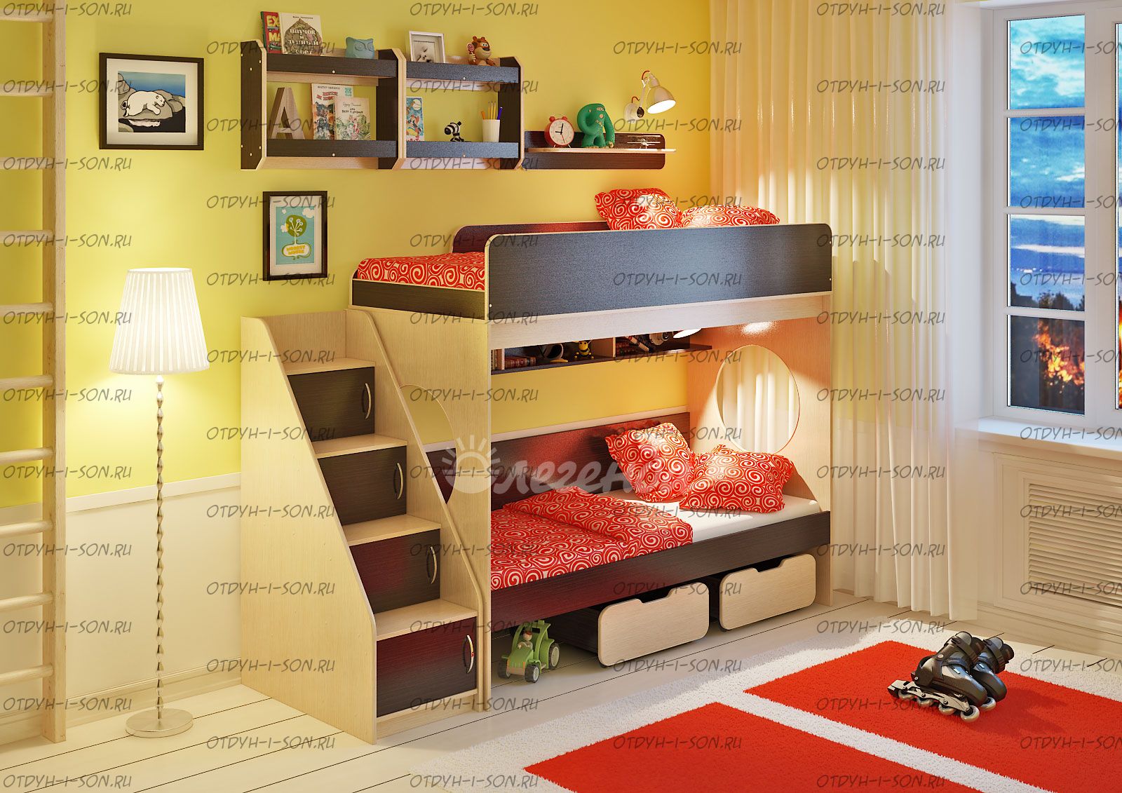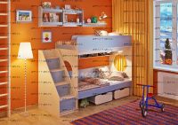Над нижним спальным местом располагается встроенная трёхсекционная полка, в которой удобно хранить книги, учебники, тетради, канцелярию и другие нужные вещи.