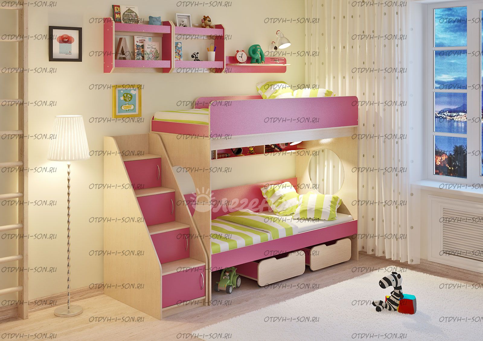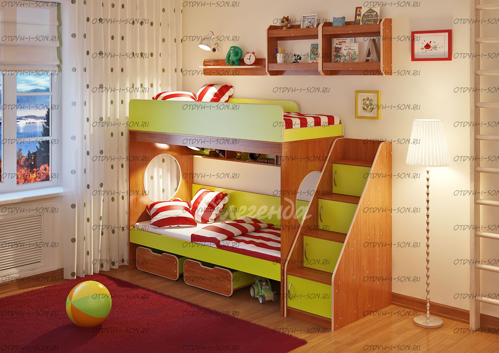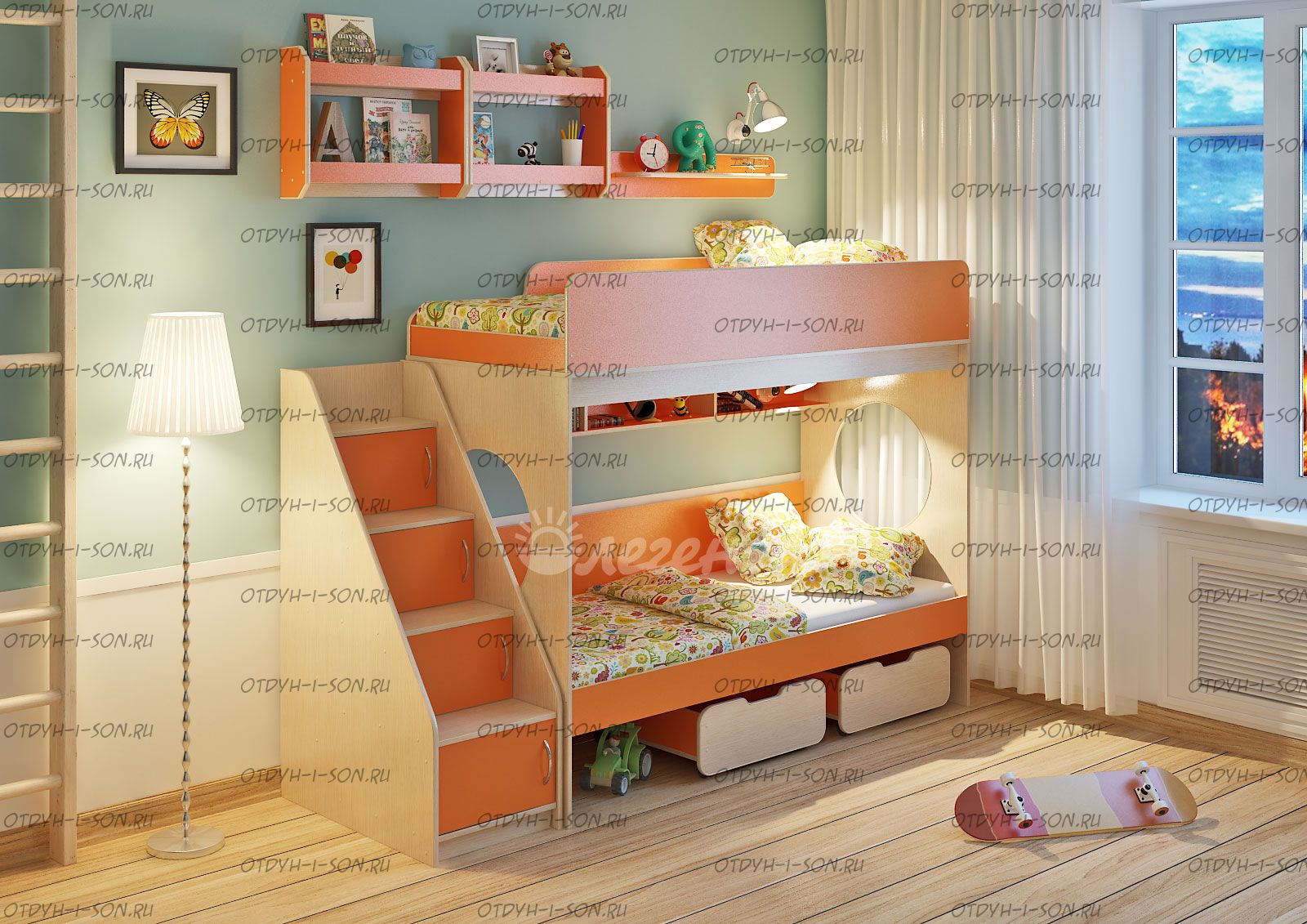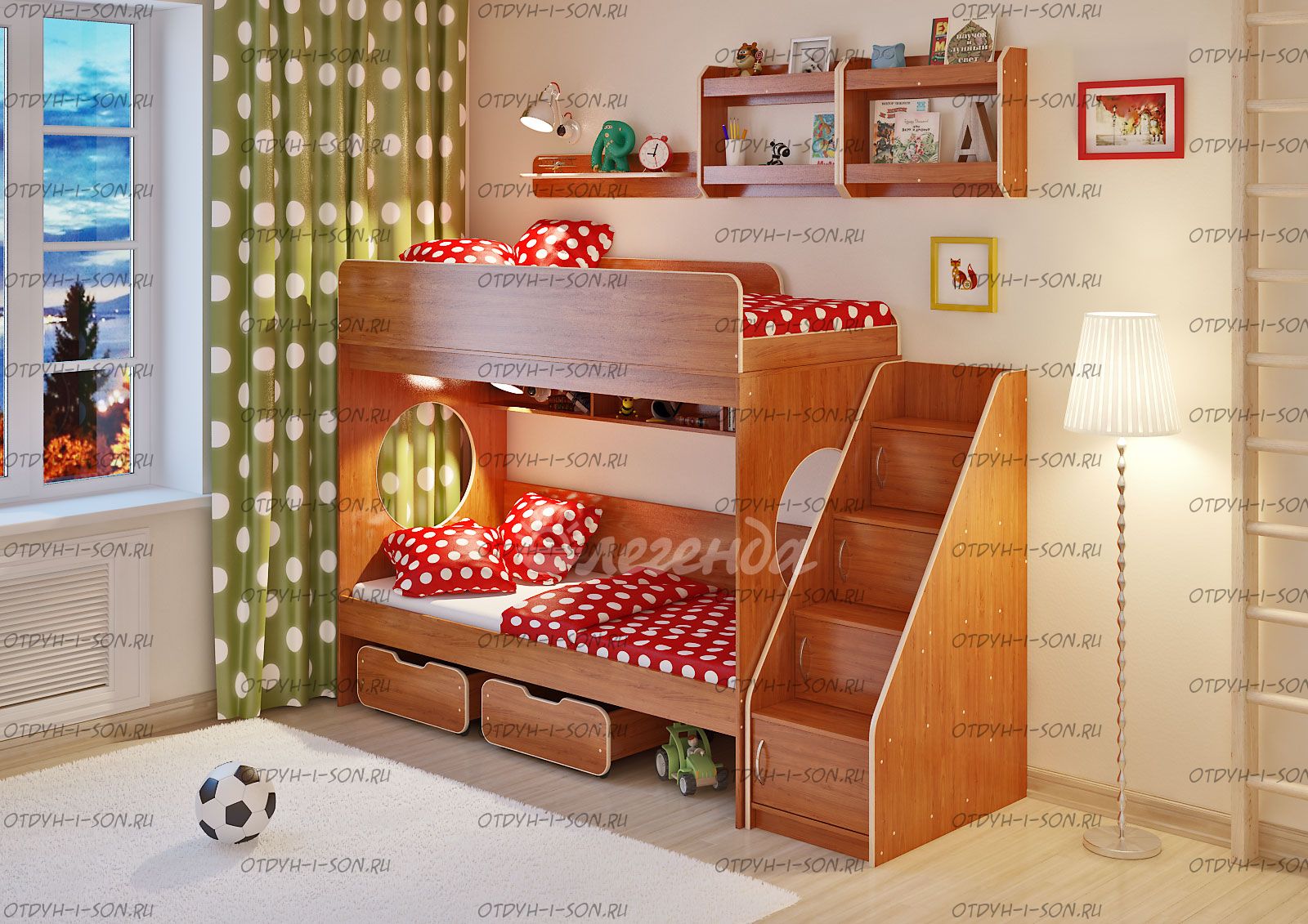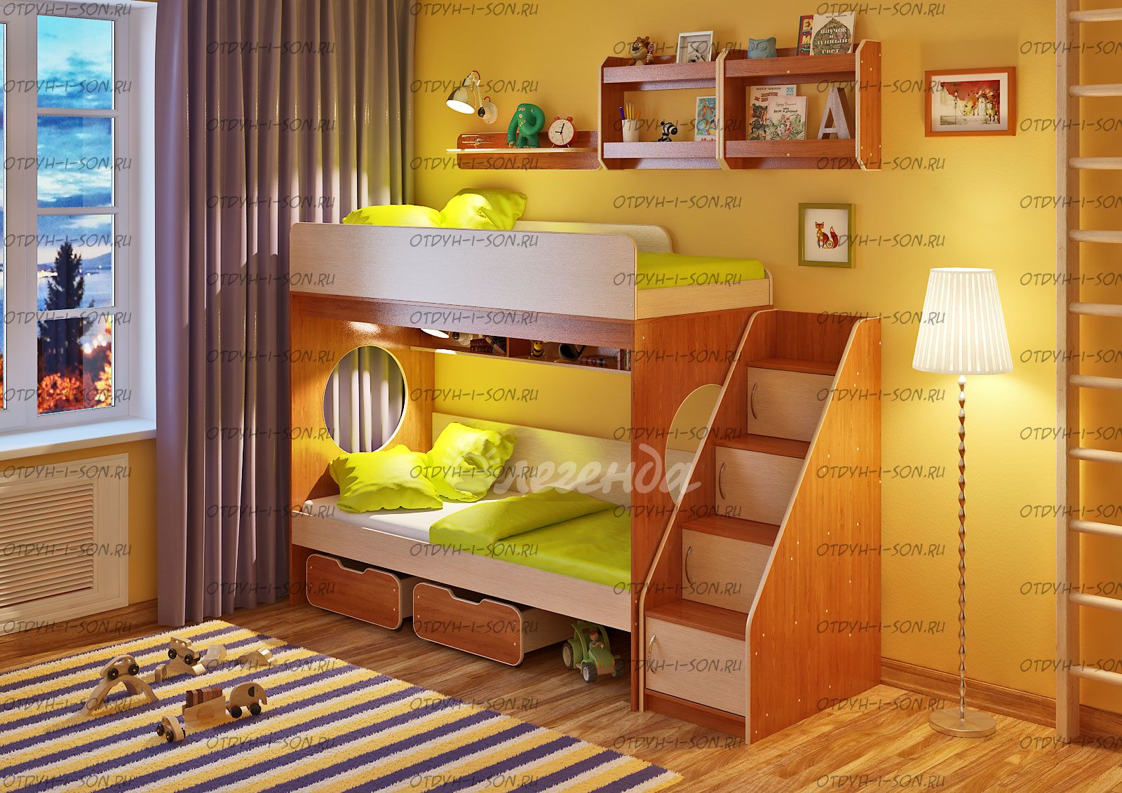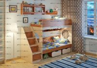 Двухъярусная кровать Легенда-7.3 с полками Комплектация: Кровать двухъярусная 7 - 80х190: см. Лестница ЛУ-10 Полка Л-01 Полка Л-02 - 2 шт. Характеристики: Спальное место: 80Х190см. Внешние габариты: Рекомендуемая высота матраса: 5-15см Вес: 177 кг Объем: 0,46 м3 Кол-во коробок 13 шт Цвет корпуса: ольха, венге светлый Цвет фасада: венге светлый, ольха, венге темный, голубой, оранжевый, розовый, лайм Двухъярусная кровать Легенда 7.3 с полками – правильно организованное пространство для сиблингов. Оптимальное соотношение цены и качества. Комплект занимает немного места - решение для площади малых габаритоэкономия пространства. Классическая двухъярусная кровать с двумя большими параллельными спальными местами размером 1900х800. Над нижним спальным местом располагается встроенная трёхсекционная полка, в которой удобно хранить книги, учебники, тетради, канцелярию и другие нужные вещи. Два вместительных ящика под кроватью удобно выкатываются и закатываются, так как оборудованы колёсиками. Ящики послужат верными помощниками в организации хранения игрушек, белья или иных вещей. Световое окно - дополнительное освещение, элемент для игры и возможность родителям наблюдать за ребенком. Высокая четырехступенчатая угловая лестница ЛУ-10 одновременно выполняет функцию стеллажа. В комплект входят фасады, с помощью которых лестница превращается в полноценные полки с дверками - как еще одно место для хранения. Две оригинальные двухъярусные полки Л-02 вместе создают единый ансамбль, превращаясь в стильную вместительную антресоль. Подойдут для хранения как небольших, так и высоких предметов. Дополнительный бортик защищает содержимое полок от падений. Простая одноярусная полка Л-01 идеально дополнит комплект. Она отлично смотрится как рядом, так и между двумя полками Л-02. Боковые бортики и мягкий противоударный кант – дополнительная безопасность для детей. Для Вашего удобства во всех изделиях «Легенда» все бортики спального места можно менять местами. По Вашему выбору комплект может быть собран как на левую, так и на правую сторону.