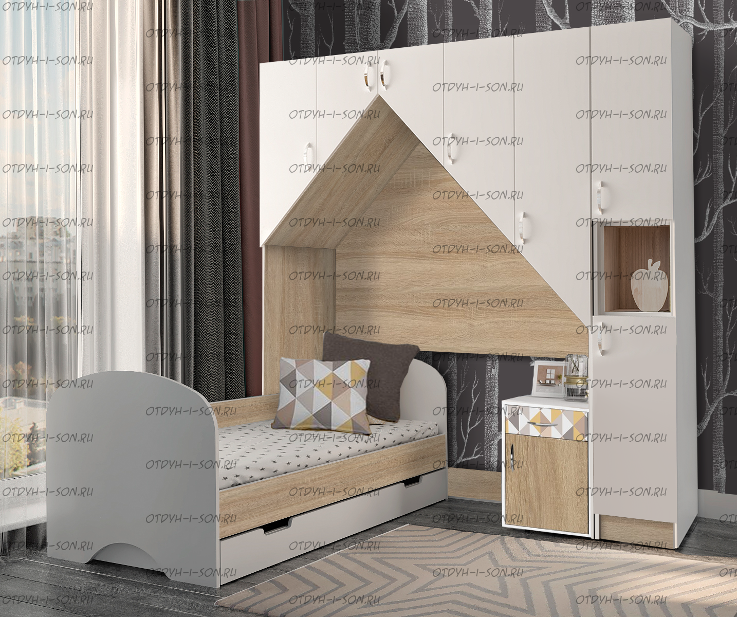Детская комната Нордик 1 Характеристики: Размер спального места: 80х160 см. Комплектация композиции: Кровать одноярусная Нордик Длина 163,2 х Высота 56,2 х Ширина 83,2 см. Спальное место 160х80 см. Выкатной ящик для кровати Домик Сказка Шкаф двухдверный Нордик 66,8 х Высота 200,4 х Глубина 51,9 см. Мост надкроватный Нордик Длина 167 х Высота 200,4 х Глубина 51,9 см. Шкаф пенал Нордик Длина Длина 33,4 х Высота 200,4 х Глубина 51,9 см.