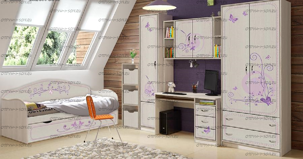 Детская комната Фанки Лилак №9 Комплектация: Кровать со спинкой Фанки Кидз Лилак, арт. 40021 (ШхГхВ): 1632х736х890 мм. Стеллаж 13/69 для хранения с ящиками 13/70 Фанки Кидз (ШхГхВ): 402х360х1174 мм. Шкаф-пенал с полками в комплекте 13/10 Фанки Лилак (ШхГхВ): 393х520х2000 мм. Стол письменный с надстройкой 13/14 Фанки Лилак (ШхГхВ): 1200х600х1850 мм. Шкаф 2-дверный с ящиками 13/3 Фанки Лилак (ШхГхВ): 750х520х2000 мм. Характеристики: Размер спального места: 70х160 см. Материал: ЛДСП 16 мм (Австрия, Egger). Цвет: Дуб Кремона, Сирень, фотопринт