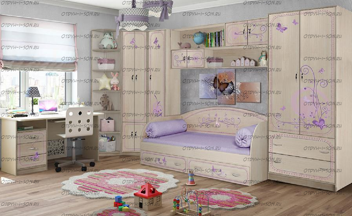 Детская комната Фанки Лилак №10 Комплектация: Кровать в виде диванчика 13/7 Фанки Лилак (ШхГхВ): 1935х850х850 мм. Полка навесная 13/12 Фанки Лилак (ШхГхВ): 1935х330х660 мм. Секция угловая 13/56 Фанки Лилак (ШхГхВ): 393х520х2000 мм. Шкаф угловой 13/15 Фанки Лилак (ШхГхВ): 520х900х2000 мм. Шкаф-пенал с полками в комплекте 13/10 Фанки Лилак (ШхГхВ): 393х520х2000 мм. Шкаф 2-дверный с ящиками 13/3 Фанки Лилак (ШхГхВ): 750х520х2000 мм. Стол письменный 13/1 Фанки Лилак (ШхГхВ): 1200х600х750 мм. Характеристики: Размер спального места: 80х190 см. Материал: ЛДСП 16 мм (Австрия, Egger). Цвет: Дуб Кремона, Сирень, фотопринт