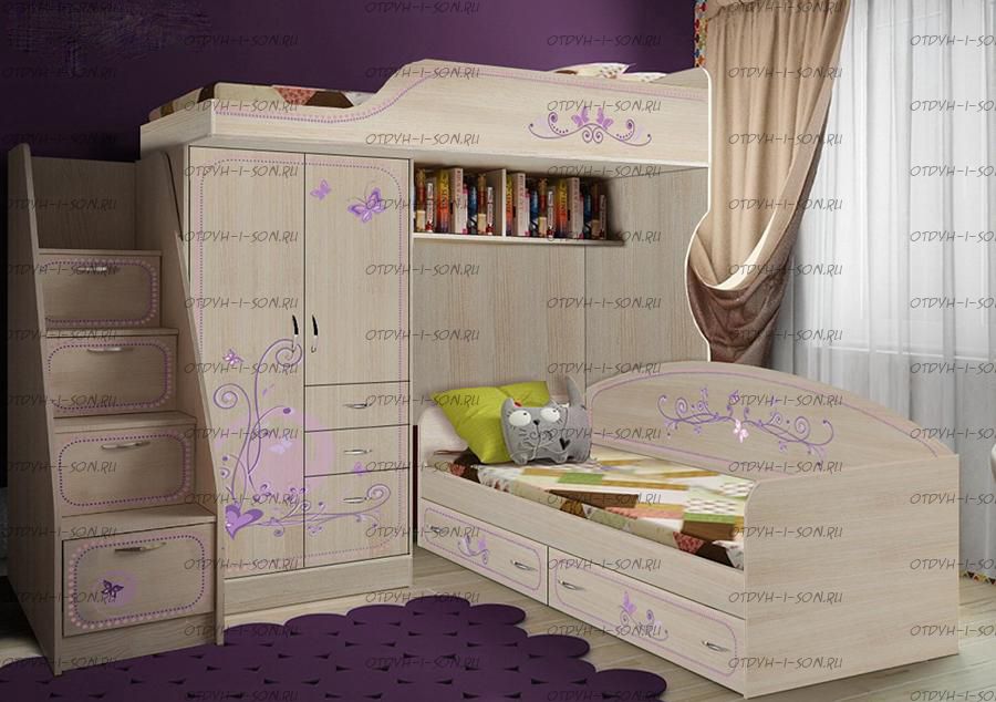 Кровать двухъярусная Фанки Лилак №5 Комплектация: Кровать-чердак Фанки Лилак, арт. 4/1 (ШхГхВ): 2160х840х1890 мм. Кровать в виде диванчика 13/7 Фанки Лилак (ШхГхВ): 1935х850х850 мм. Лестница-тумба 13/8 Фанки Лилак (ШхГхВ): 400х1000х1500 мм. Характеристики: Размер спального места: 80х190+80х190 см. Материал: ЛДСП 16 мм (Австрия, Egger). Цвет: Дуб Кремона, Сирень, фотопринт
