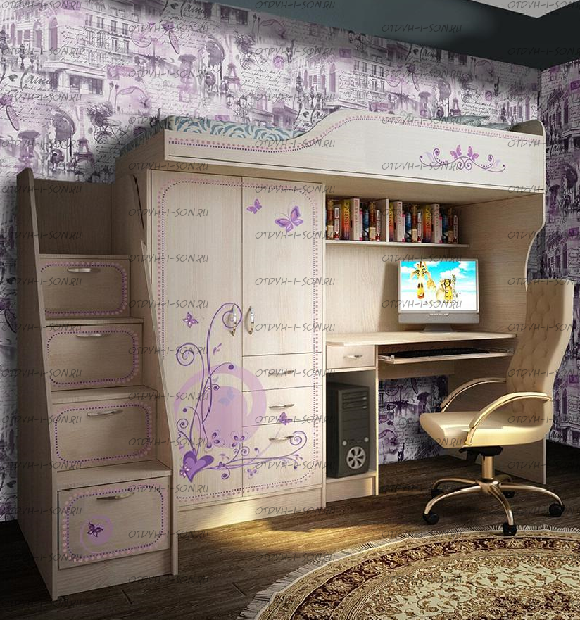 Кровать-чердак Фанки Лилак №7. Кровать-чердак Фанки Лилак состоит из двух модулей, которые вместе создают единую безопасную и прочную конструкцию для ребенка. Она отличается тематическими рисунками в виде цветов и узоров, орнаментов и бабочек, поэтому приобретается исключительно для девочек в любом возрасте. Декор наносится с помощью прямой уф-фотопечати.