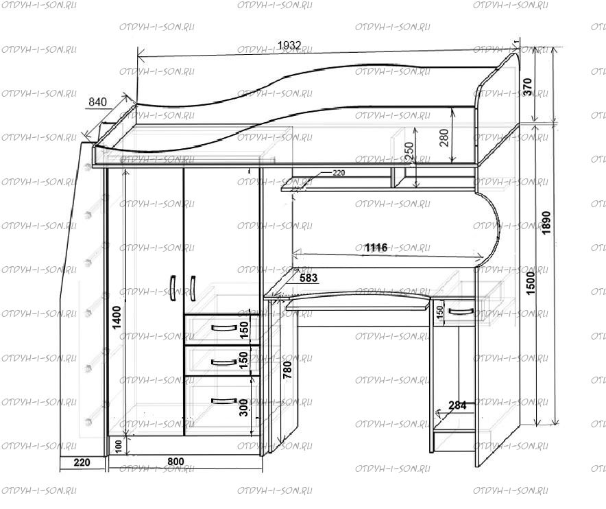 Чердак состоит из спального места на втором этаже (матрац не входит в стоимость комплекта), на нижнем этаже: компьютерный стол и полка, а так же гардероб с ящиками (3 шт).