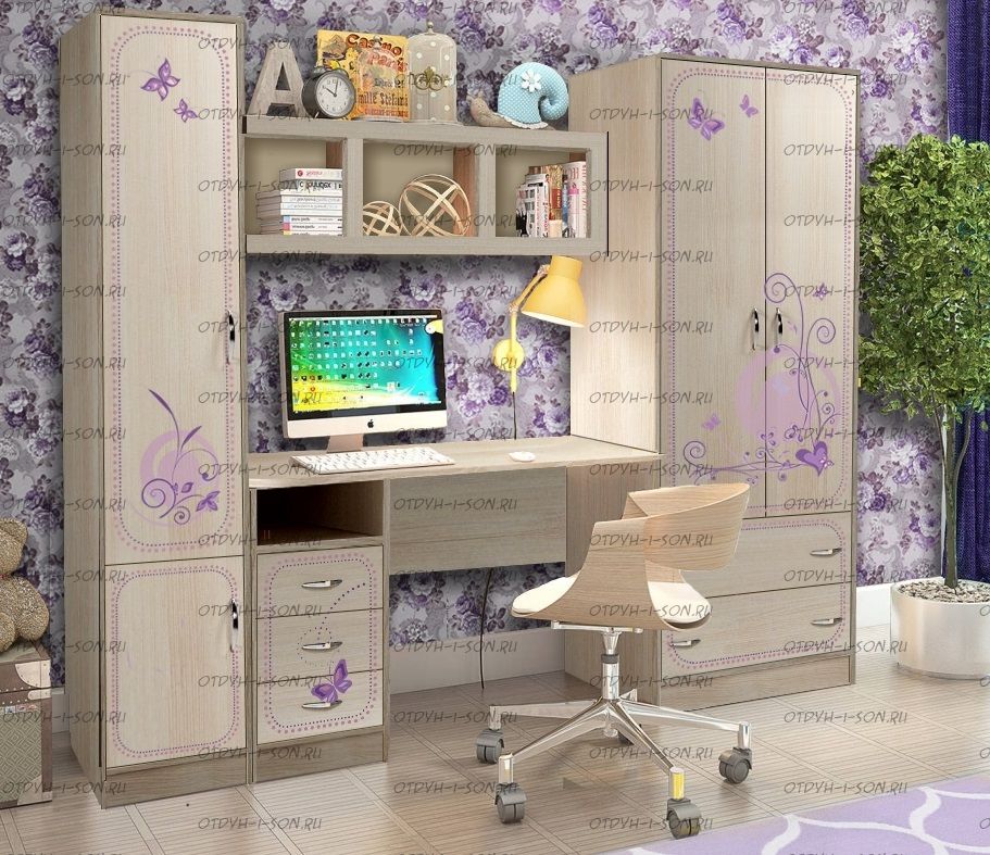 Уголок школьника Фанки Лилак №8 Комплектация: Шкаф-пенал с полками в комплекте 13/10 Фанки Лилак (ШхГхВ): 393х520х2000 мм. Шкаф 2-дверный с ящиками 13/3 Фанки Лилак (ШхГхВ): 750х520х2000 мм. Стол письменный 13/1 Фанки Лилак (ШхГхВ): 1200х600х750 мм. Характеристики: Материал: ЛДСП 16 мм (Австрия, Egger). Цвет: Дуб Кремона, Сирень, фотопринт