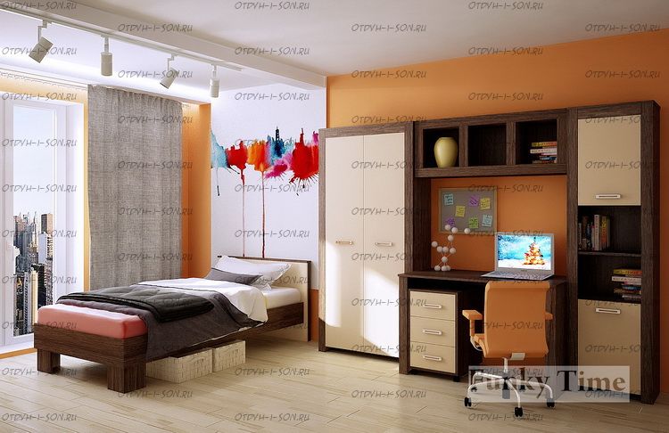 Детская комната Фанки Тайм №1 Комплектация: Кровать Фанки Тайм ФТ-02 110х200 см Полка Фанки Тайм ФТ-14 (1180х314х450 мм) Стол прямой Фанки Тайм ФТ-09 (1180х600х750 мм) Тумба Фанки Тайм ФТ-08 (Тумба Фанки Тайм ФТ-08) Пенал Фанки Тайм ФТ-04 (500х319х1950 мм) Шкаф Фанки Тайм ФТ-05 (930х319х1950 мм) Характеристики: Размер спального места: 110х200 см Цвет корпуса: Дуб шамони Цвет фасада: Дуб кремона, оранжевый, розовый,крем ваниль, голубой, текстиль