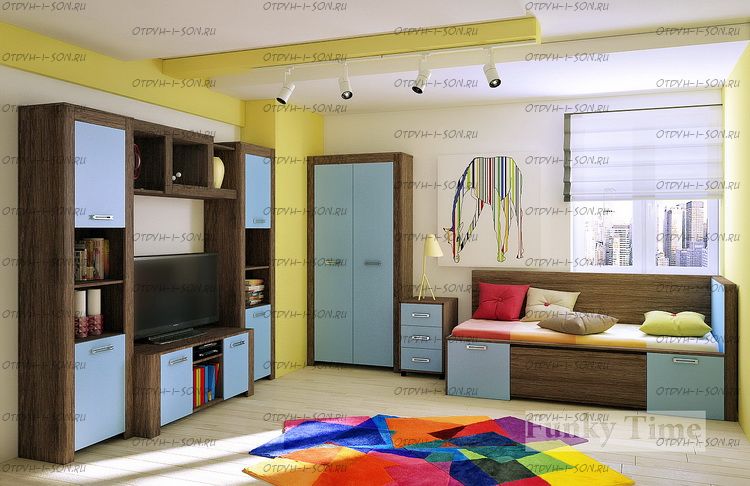 Детская комната Фанки Тайм №6 Комплектация: Кровать Фанки Тайм ФТ-03 80х190 см Полка Фанки Тайм ФТ-13 (1180х314х450 мм) Тумба под тв Фанки Тайм ФТ-07 (1180х500х483 мм) Тумба Фанки Тайм ФТ-08 (Тумба Фанки Тайм ФТ-08) Пенал Фанки Тайм ФТ-04 (500х319х1950 мм) Шкаф Фанки Тайм ФТ-05 (930х319х1950 мм) Характеристики: Размер спального места: 80х190 см Цвет корпуса: Дуб шамони Цвет фасада: Дуб кремона, оранжевый, розовый,крем ваниль, голубой, текстиль