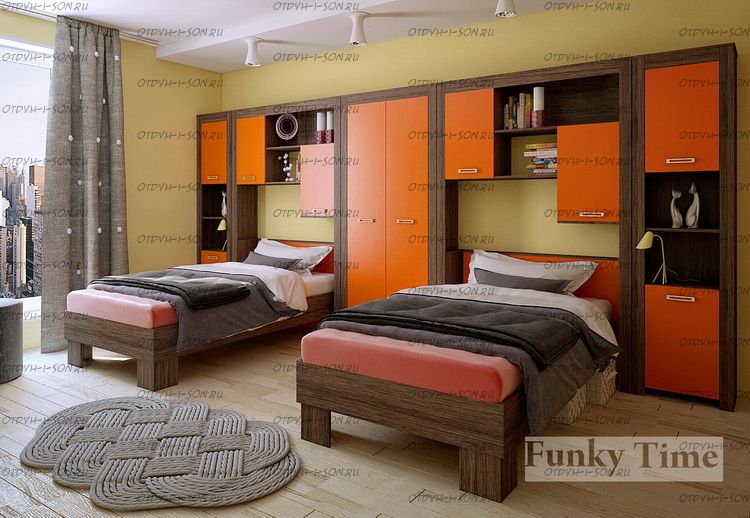 Детская комната Фанки Тайм №7 Комплектация: Кровать Фанки Тайм ФТ-02 110х200 см - 2 шт. (Вес 104 кг., Объем 0,22) Стеллаж-ниша (надстройка) Фанки Тайм ФТ-11 (1360х319х1950 мм) - 2шт. (Вес 120,5 кг., Объем 0,26) Пенал Фанки Тайм ФТ-04 (500х319х1950 мм) - 2шт. (Вес 78 кг., Объем 0,2) Шкаф Фанки Тайм ФТ-05 (930х319х1950 мм) - 1шт. (Вес 51,5 кг., Объем 0,9) Характеристики: Размер спального места: 110х200 см Цвет корпуса: Дуб шамони Цвет фасада: Дуб кремона, оранжевый, розовый,крем ваниль, голубой, текстиль
