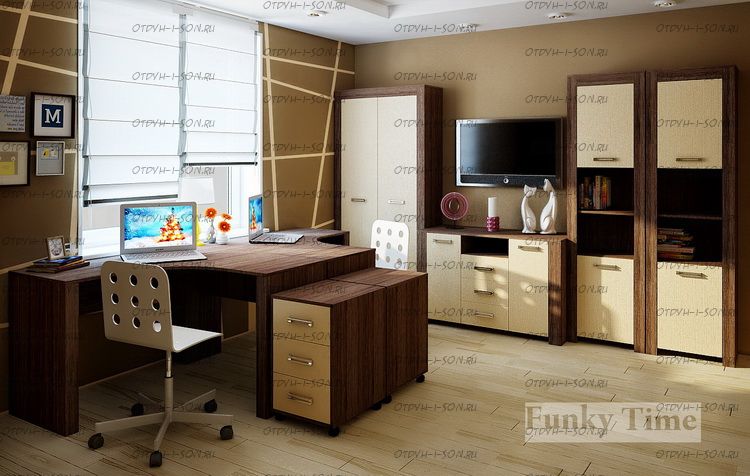 Детская комната Фанки Тайм №8 Комплектация: Стол угловой Фанки Тайм ФТ-10 (1200х1200х750 мм)-1шт. Тумба Фанки Тайм ФТ-08 (Тумба Фанки Тайм ФТ-08)-2шт. Пенал Фанки Тайм ФТ-04 ( 500х319х1950 мм)-2шт. Шкаф Фанки Тайм ФТ-05 (930х319х1950 мм)-1 шт. Тумба под тв Фанки Тайм ФТ-07 (1180х500х483 мм)-1шт. Характеристики: Цвет корпуса: Дуб шамони Цвет фасада: Дуб кремона, оранжевый, розовый,крем ваниль, голубой, текстиль