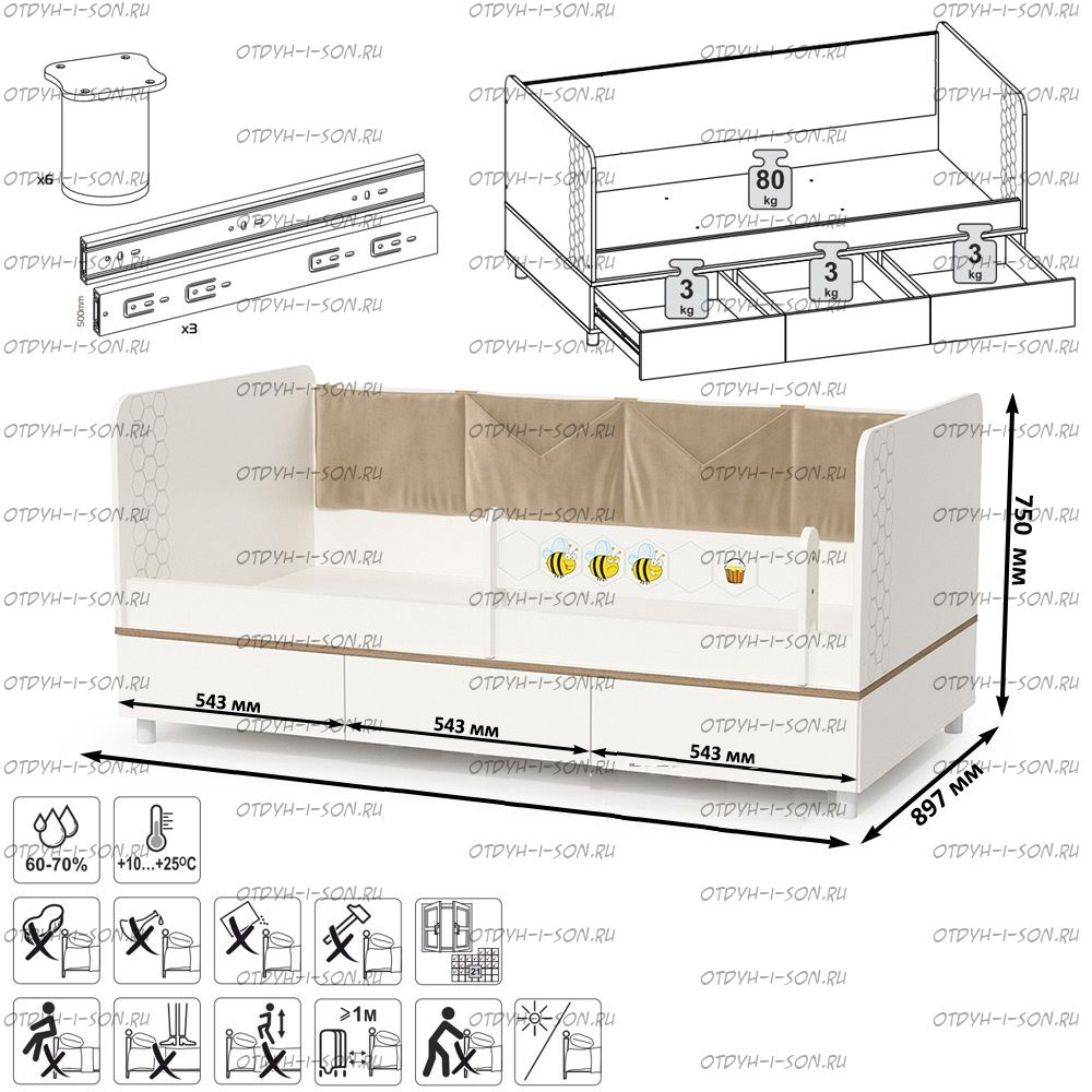 Спальное место: 800х1600 мм. Основание (настил ЛДСП) в комплекте, матрас приобретается отдельно.
