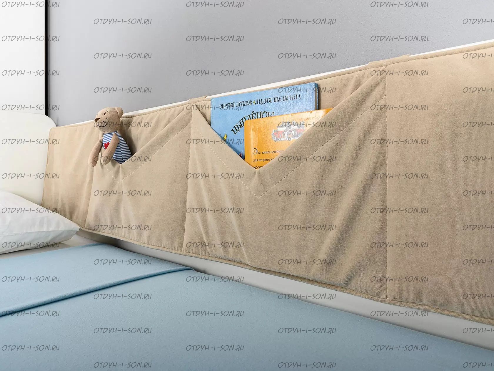 Односпальная кровать Эйп оснащена съёмным мягким элементом с карманами — можно легко снять для стирки.