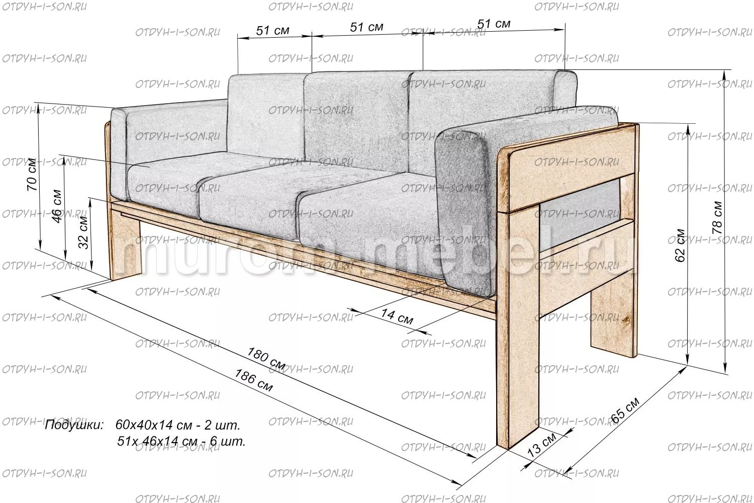 Высота от пола до сиденья:32 см, с подушками 46 см