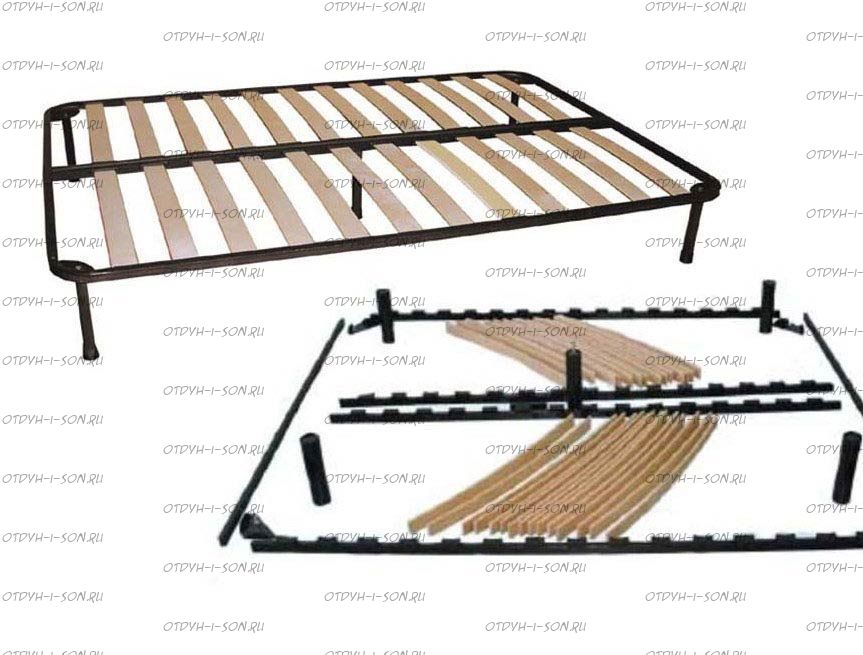 Кроватные ортопедические основания представляют собой металлическую раму с прикрепленными к ней ламелями из березового шпона для установки в короб кровати и применяются в комплекте с ортопедическими матрасами для создания спального места. Так же, как и комплектующие ортопедического матраса (конечно лишь в небольшой степени), прогибаясь, ламели выравнивают поверхностное давление. Помимо этого, за счет пружинящего эффекта, ламели частично разгружают пружинный блок, что увеличивает срок эксплуатации матраса.