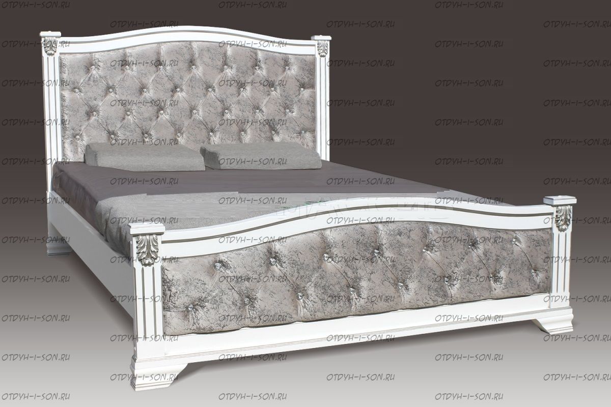 Кровать Азалия со стразами Характеристики: Размер спального места: 120х190/195/200, 140х190/195/200, 160х190/195/200, 180х190/195/200, 200х190/195/200 см. Комбинированная кровать: Массив сосны и вставки из экологически чистой мебельной фанеры Спинка в изголовье имеет резные элементы с художественной резьбой Габариты кроватей: Высота днища кроватей: с матрасом 45см. Высота от пола до спального места: 25 см. Высота от пола до царги: 19 см. Ширина царги - 16 см., из них 10 см. составляет бортик, который держит матрас, остальные 6 см. под спальным местом, закрывают собой фурнитуру Основание кровати: подматрасники, ламельное основание - за дополнительную плату Ламельное основание: да, в комплекте Подкроватные ящики: за дополнительную плату Ящики изготавливаются на колесиках и не прикрепляются к кровати, поэтому могут устанавливаться "лицом" к любой из боковыйх сторон кровати. Высота спинки кровати: головная 88-90см. ножная 60-65см., нестандарт возможен. Крепления кровати: В базовом варианте с тыльной стороны ящиков декоративной планки не предусмотрено. Вес: 50кг. Объем:0,26 м3 Любые размеры, в том числе и нестандартные Цвет: венге 1, венге 2, венге 3, венге 4, венге тон 2, коричневый тон 2, коричневый 1, коричневый 2, коричневый 3, коричневый 4, красно-коричневый тон 2, красно-коричневый 1, красно-коричневый 2, красно-коричневый 3, красно-коричневый 4, лак Изготовление из массива березы плюс 30% Изготовление в белом цвете или слоновая кость плюс 20%