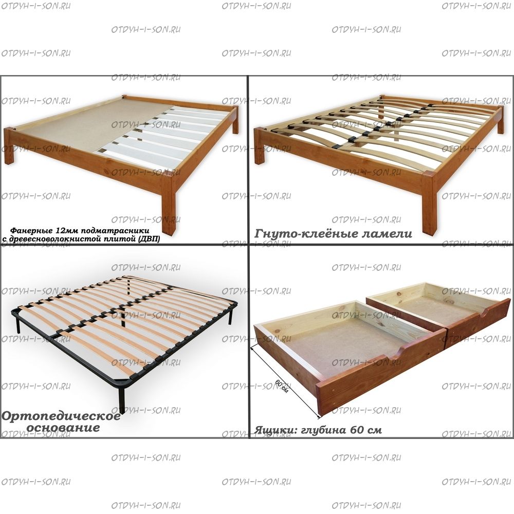 В базовом исполнении основание у кровати - поперечные брусья и лист оргалита. Также можно купить кровать вместе с ламельным основанием от Фабрики ВМК Шале и выкатными ящиками. Выкатные ящики сделают кровать еще более функциональной. Они не закрепляются в кровати и поэтому могут выполняться открыванием в любую из сторон кровати. Ламельные основания от фабрики ВМК Шале изготавливаются из гнутых ламелей в металлическом основании (4 ножки).
