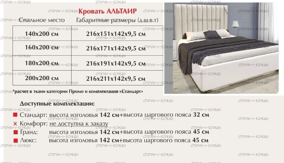 Кровать Альта-Люкс (б/о) Характеристики: Размер спального места: 140х190, 140х200, 160х190, 160х200, 180х190, 180х200, 200х190, 200х200 см. Высота изголовья Стандарт: 172 см. (142 см. +32 см. (высота царгового пояса)) Высота изголовья Гранд: 187 см. (142 см. +45 см. (высота царгового пояса)) Высота изголовья Люкс: 187 см. (142 см. +45 см. (высота царгового пояса)) Беспрецендентная толщина ЛДСП каркаса кровати: 20 и 25 мм.