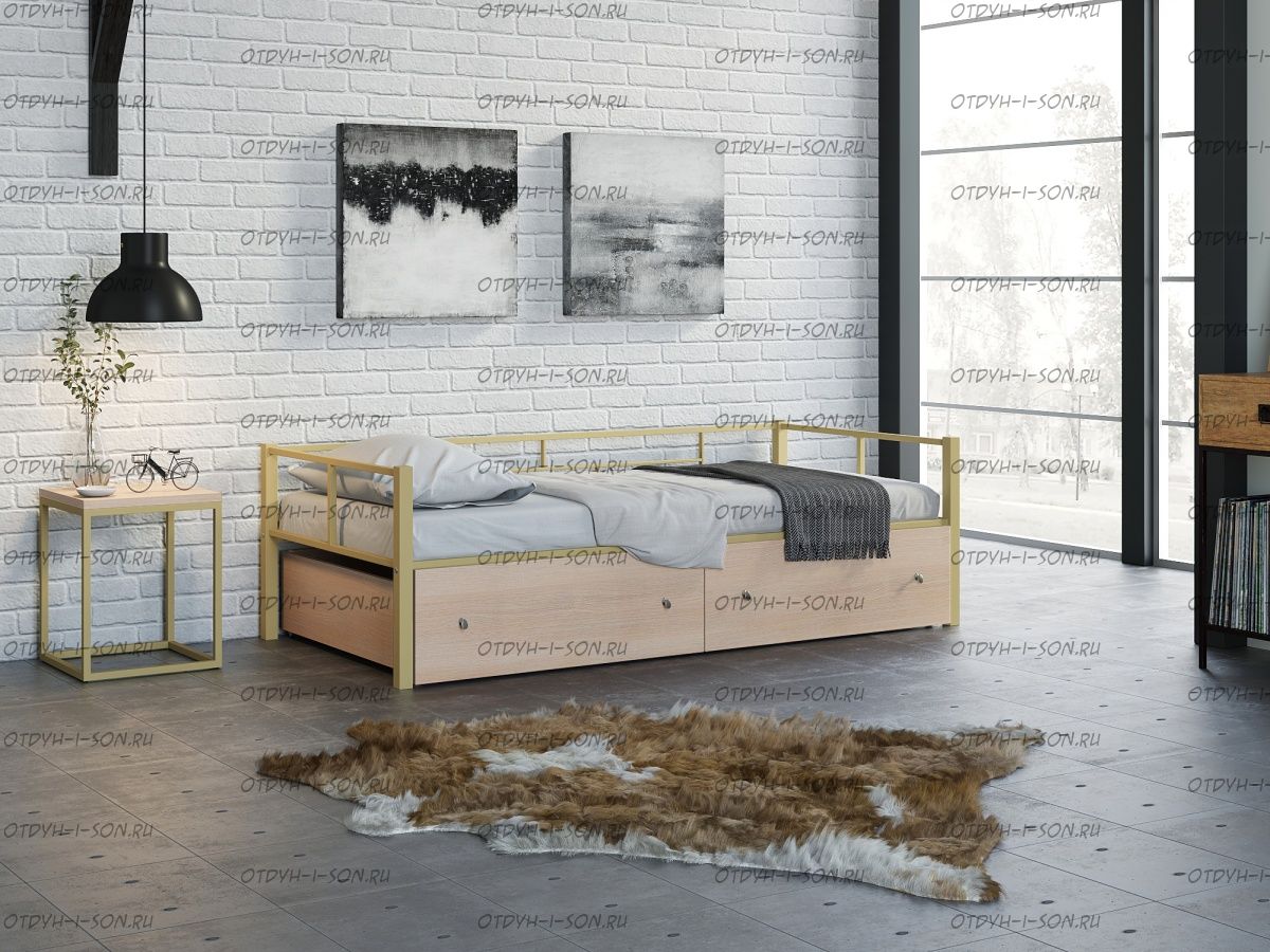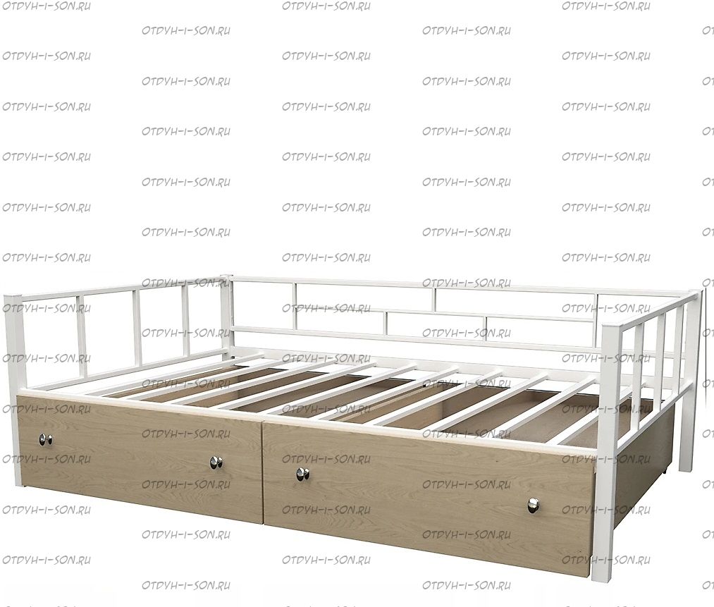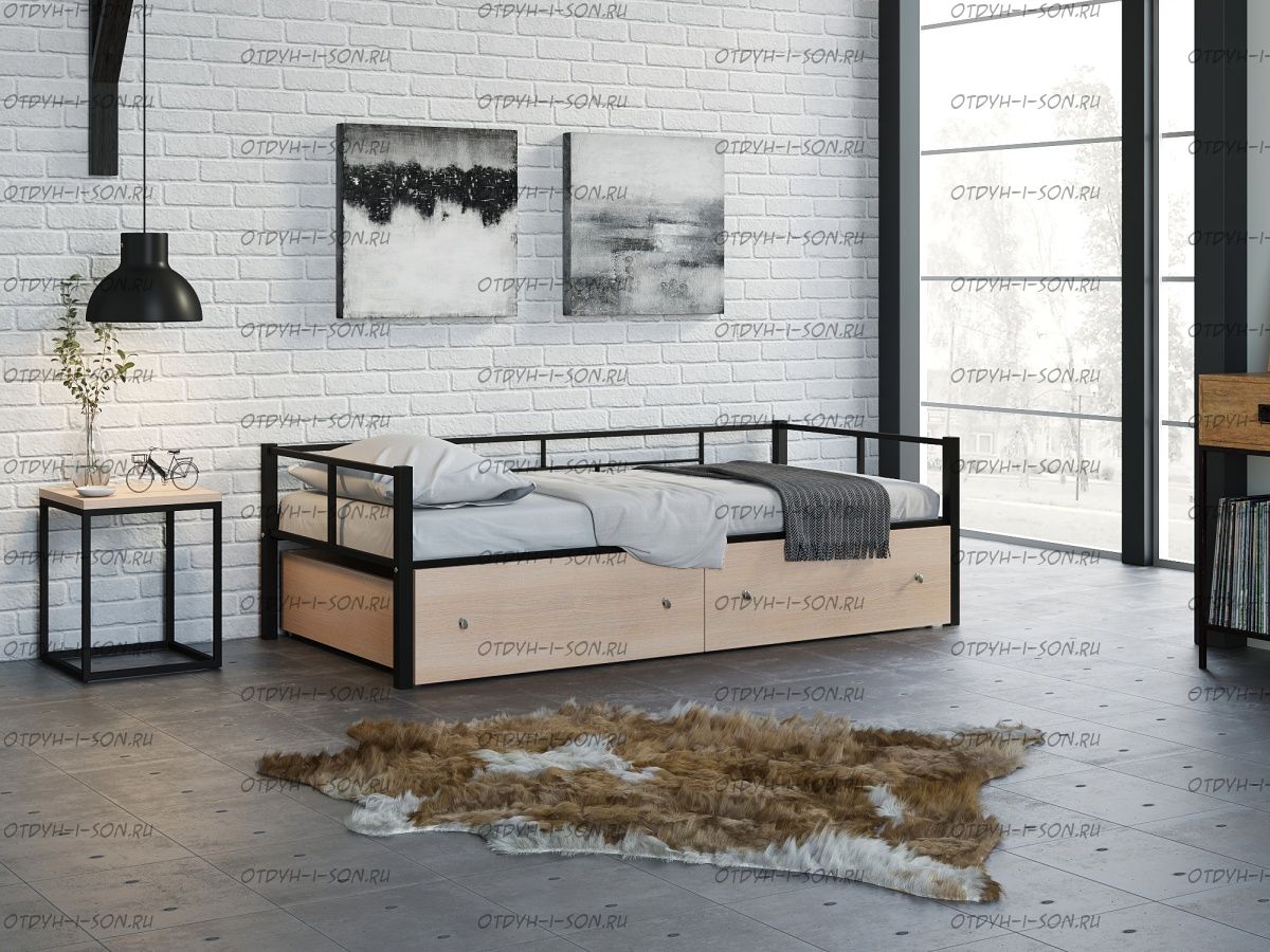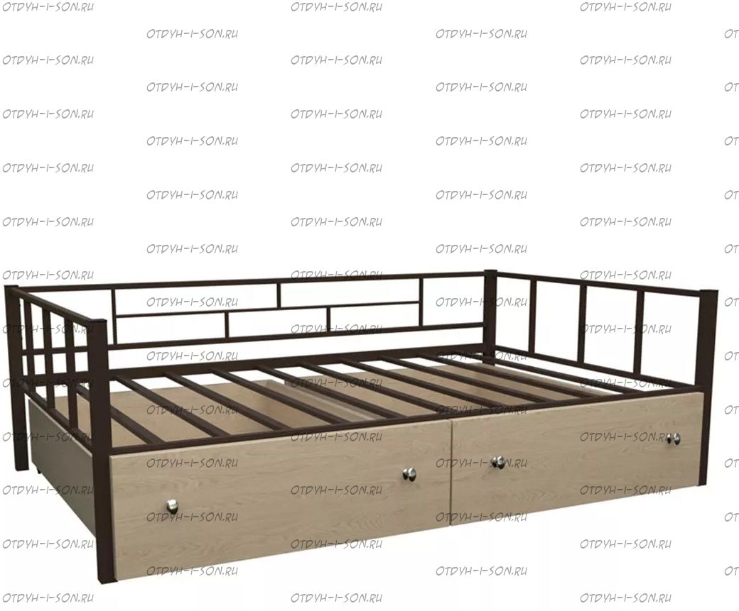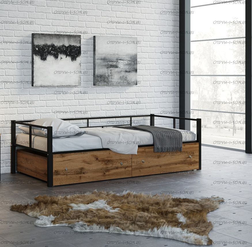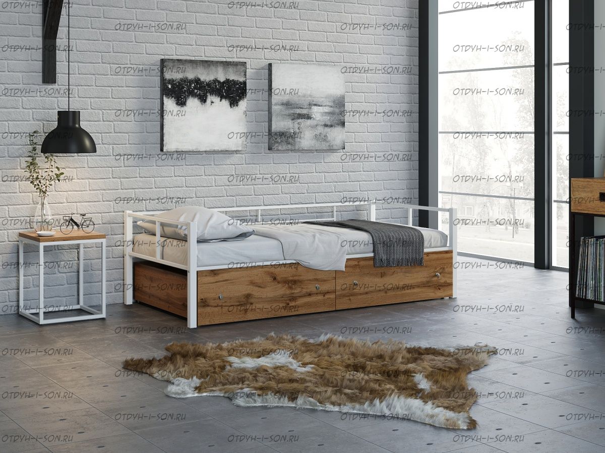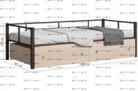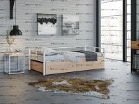 Кровать Арга с ящиками Характеристики: Спальное место: 90х190 Внешние размеры (ДхШхВ): Длина 198 х Ширина 96 х Высота 60 Высота от пола до спального места: Материал каркаса Металл Материал фасада ЛДСП Нагрузка на спальное место: 150 кг Вес: Цвет каркаса: бежевый, черный, коричневый, Черный ящики Цвет фасада: Дуб беленый, Дуб ватан Гарантия 12 месяцев