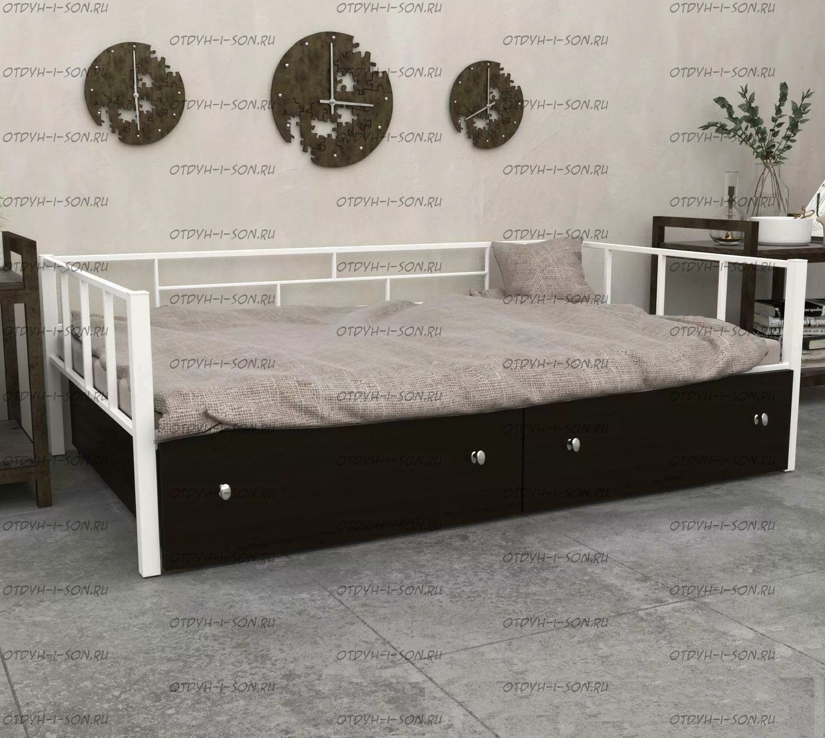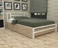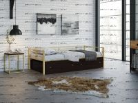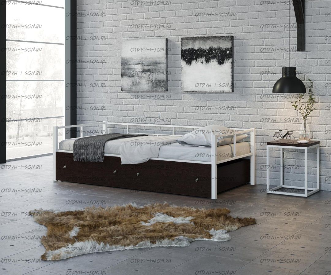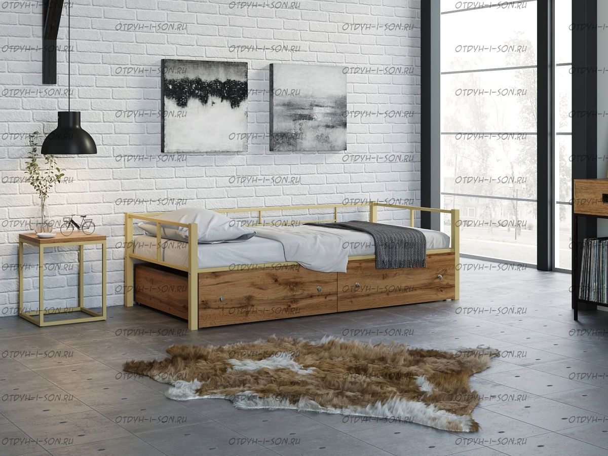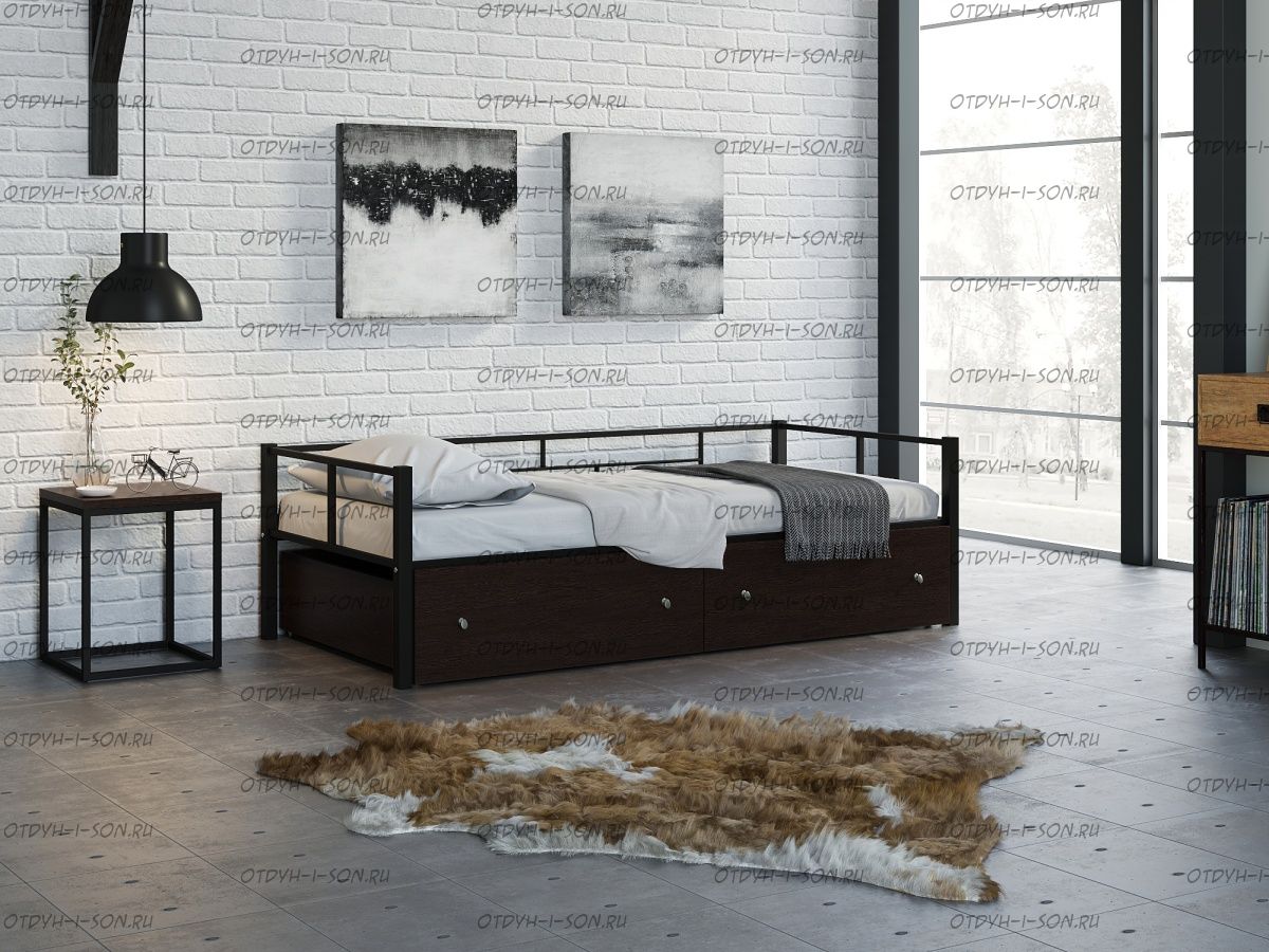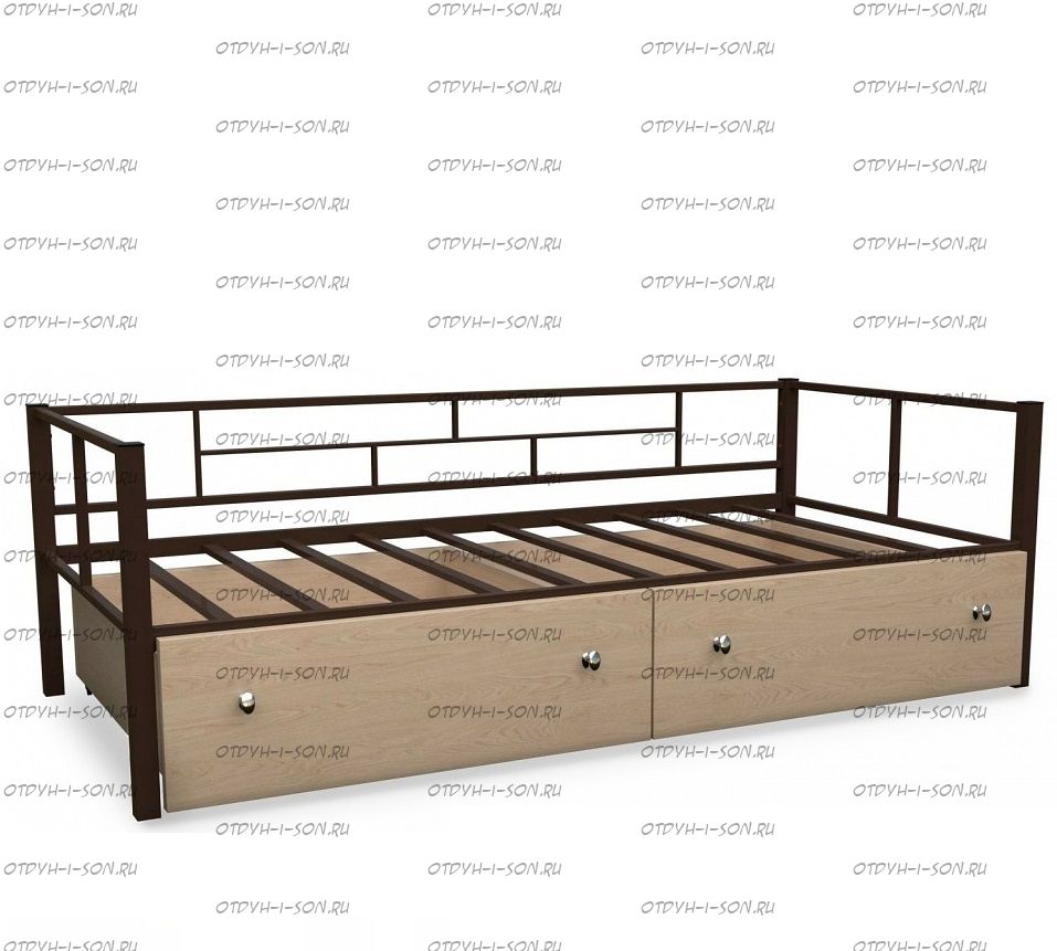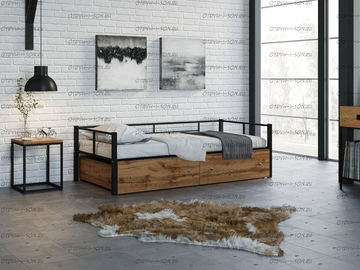 Кровать Арга с ящиками Характеристики: Спальное место: 90х190 Внешние размеры (ДхШхВ): Длина 198 х Ширина 96 х Высота 60 Высота от пола до спального места: Материал каркаса Металл Материал фасада ЛДСП Нагрузка на спальное место: 150 кг Вес: Цвет каркаса: бежевый, черный, коричневый, Черный ящики Цвет фасада: Дуб беленый, Дуб ватан Гарантия 12 месяцев