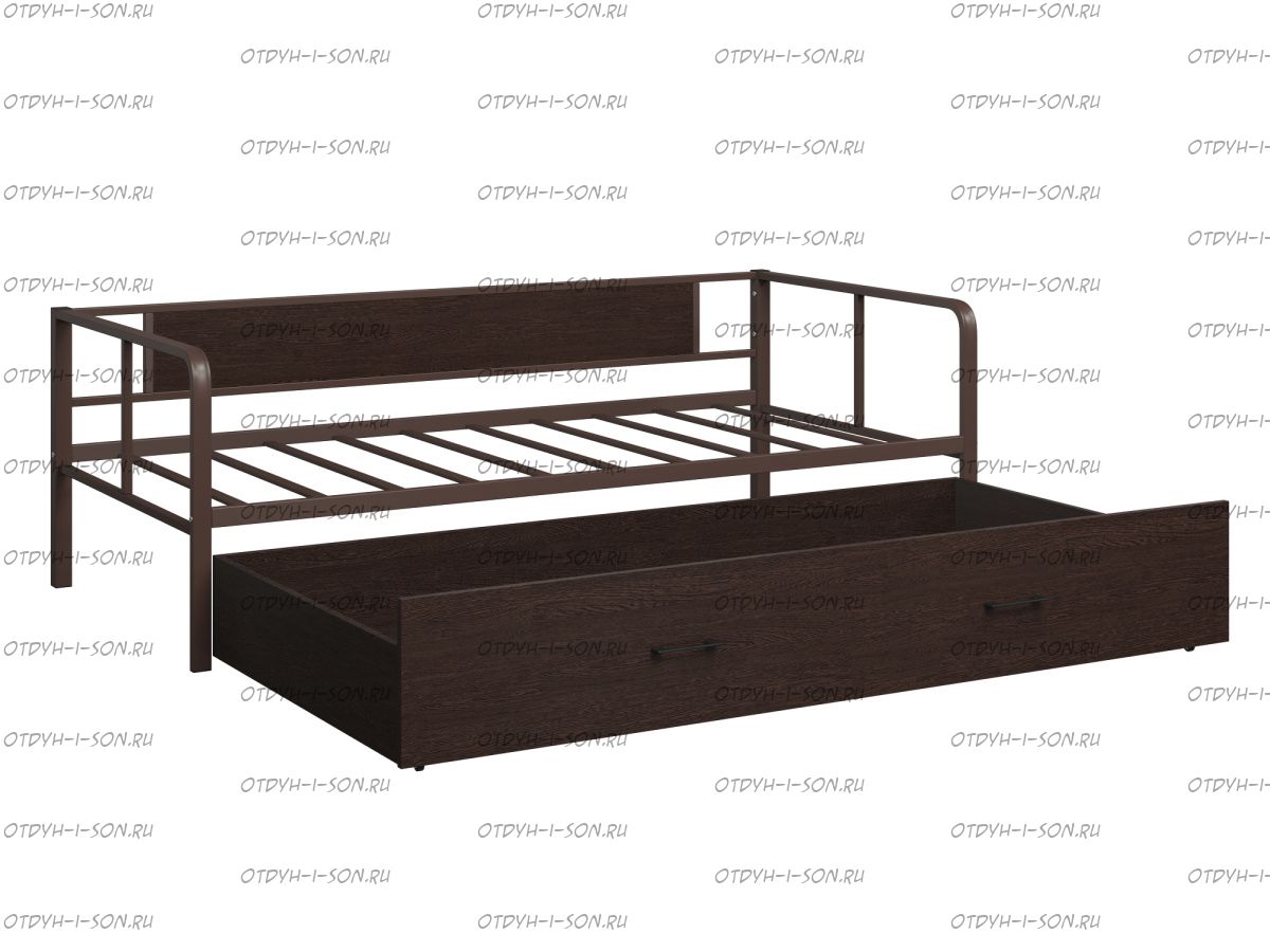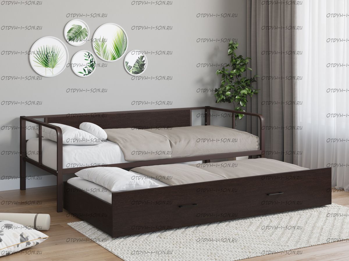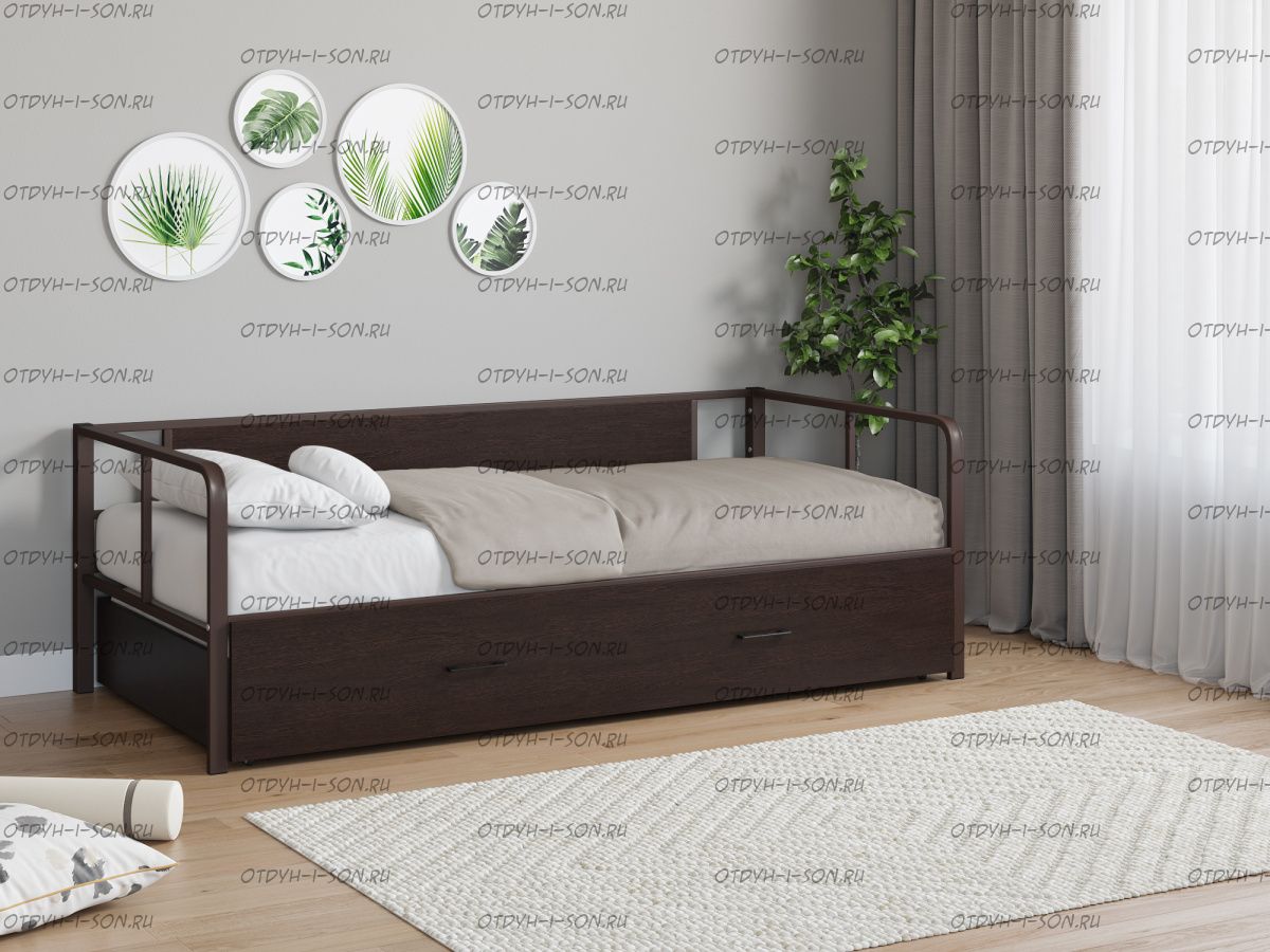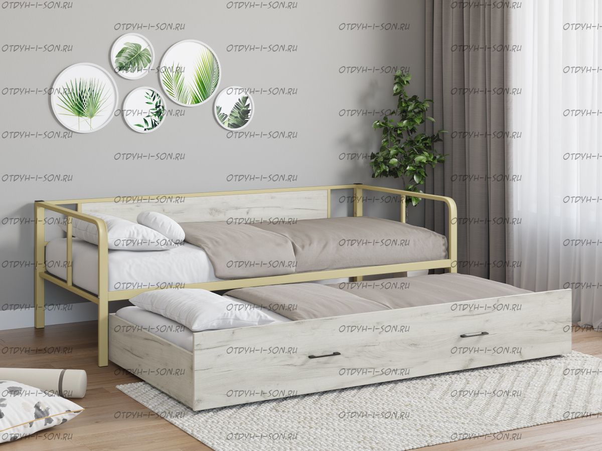 Кровать Арга Лофт выкатная Характеристики: Спальное место: 90х190/120х190 Внешние размеры (ДхШхВ): Длина 198 х Ширина 96/126 х Высота 60 Высота от пола до спального места: Для выкатного спального места подойдет матрас 120х185 см, высота от 16 см. Материал каркаса Металл Материал фасада ЛДСП Нагрузка на спальное место: 150 кг Вес: Цвет каркаса: бежевый, черный, коричневый, Черный ящики Цвет фасада: Дуб беленый, Дуб ватан Гарантия 12 месяцев