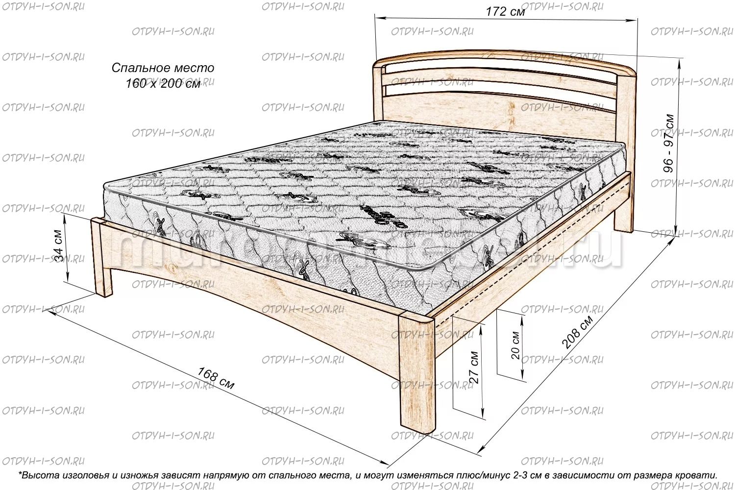 Можно заказать как стандартную комплектацию, так и различные модификации: с подъемным механизмом, с ортопедическим покрытием и т. д. Можно увеличить длину спинки, изменить размеры и внешний вид кровати.Характеристики: