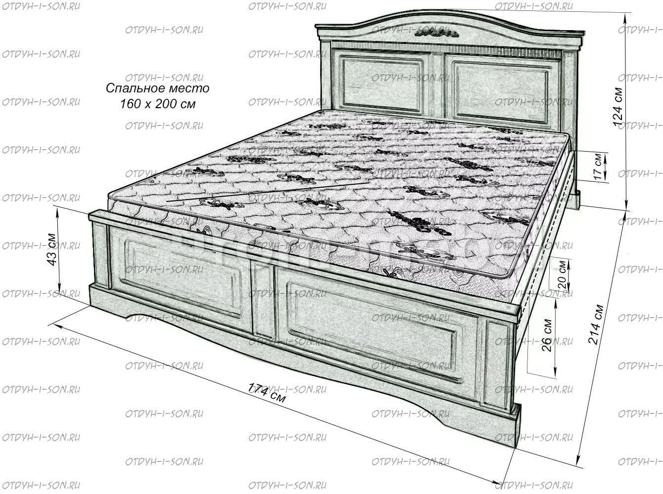 Кровать Валео Характеристики: Размер спального места: 80х190/195/200, 90х190/195/200, 120х190/195/200, 140х190/195/200, 160х190/195/200, 180х190/195/200, 200х190/195/200 см. Комбинированная кровать: Массив сосны и вставки из экологически чистой мебельной фанеры Габариты кроватей: Высота днища кроватей: Ламельное основание: да, в комплекте Подкроватные ящики: за дополнительную плату Ящики изготавливаются на колесиках и не прикрепляются к кровати, поэтому могут устанавливаться "лицом" к любой из боковыйх сторон кровати. Высота спинки в изголовье кровати: Крепления кровати: В базовом варианте с тыльной стороны ящиков декоративной планки не предусмотрено. Вес: 45-60кг. Любые размеры, в том числе и нестандартные Цвет: венге 1, венге 2, венге 3, венге 4, венге тон 2, коричневый тон 2, коричневый 1, коричневый 2, коричневый 3, коричневый 4, красно-коричневый тон 2, красно-коричневый 1, красно-коричневый 2, красно-коричневый 3, красно-коричневый 4, лак Изготовление из массива березы плюс 30% Изготовление в белом цвете или слоновая кость плюс 20%