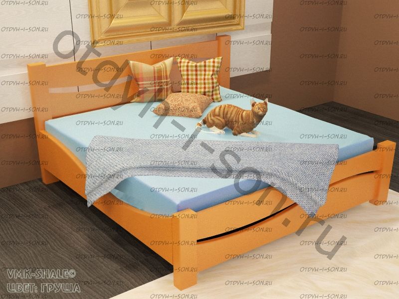 Выкатные ящики не закрепляются в кровати и поэтому могут выполняться открыванием в любую из сторон кровати. Ламельные основания от фабрики ВМК Шале изготавливаются из гнутых ламелей в металлическом основании (4 ножки).