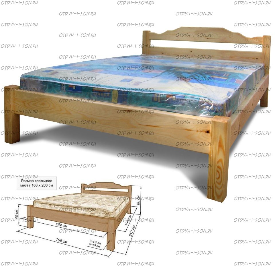 Кровать Дачник Характеристики: Размер спального места: 80х190/195/200, 90х190/195/200, 120х190/195/200, 140х190/195/200, 160х190/195/200, 180х190/195/200, 200х190/195/200 см. Комбинированная кровать: Массив сосны и вставки из экологически чистой мебельной фанеры Спинка в изголовье имеет резные элементы с художественной резьбой Габариты кроватей: Высота днища кроватей: Высота от пола до спального места: 25 см. Высота от пола до царги: 19 см. Ширина царги - 16 см., из них 10 см. составляет бортик, который держит матрас, остальные 6 см. под спальным местом, закрывают собой фурнитуру Основание кровати: да, в комплекте Подкроватные ящики: за дополнительную плату Ящики изготавливаются на колесиках и не прикрепляются к кровати, поэтому могут устанавливаться "лицом" к любой из боковыйх сторон кровати. Высота спинки в изголовье кровати: Крепления кровати: В базовом варианте с тыльной стороны ящиков декоративной планки не предусмотрено. Вес: 45-60кг. Вес (180х200): 50 кг. Объем (180х200): 0,3 м3 Любые размеры, в том числе и нестандартные Цвет: венге 1, венге 2, венге 3, венге 4, венге тон 2, коричневый тон 2, коричневый 1, коричневый 2, коричневый 3, коричневый 4, красно-коричневый тон 2, красно-коричневый 1, красно-коричневый 2, красно-коричневый 3, красно-коричневый 4, лак Изготовление из массива березы плюс 30% Изготовление в белом цвете или слоновая кость плюс 20%