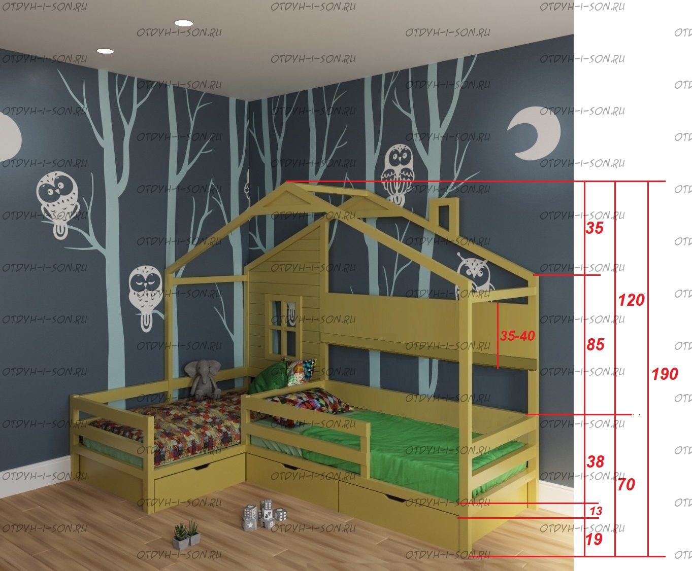 | Размеры изделия | Угловые домики по длинной стороне имеют следующие размеры: сумма длины и ширины двух спальных мест + 15 см. В случае ограниченного пространства в комнате просьба не считатьразмеры самостоятельно, а обратиться к нашим операторам. |