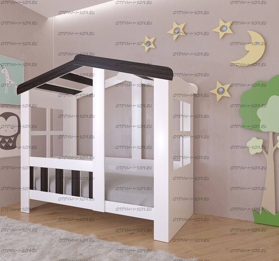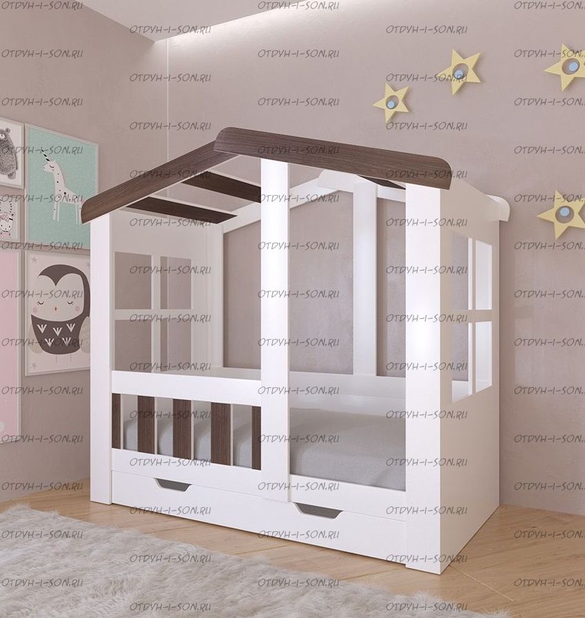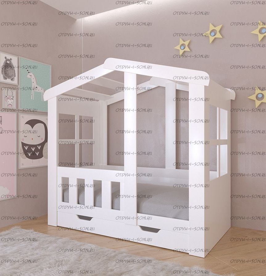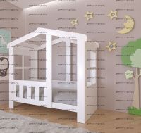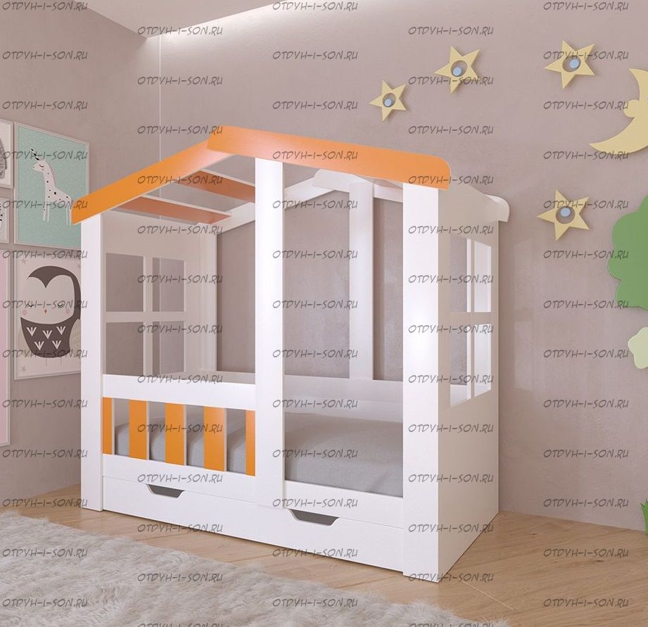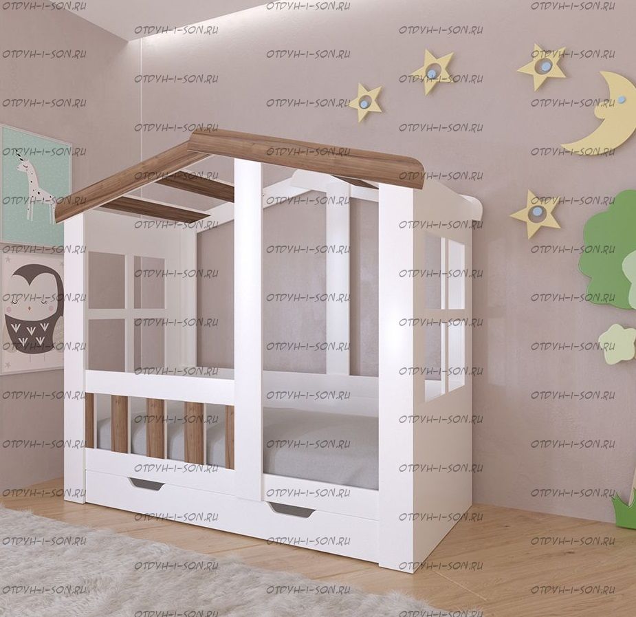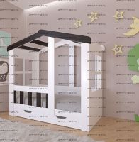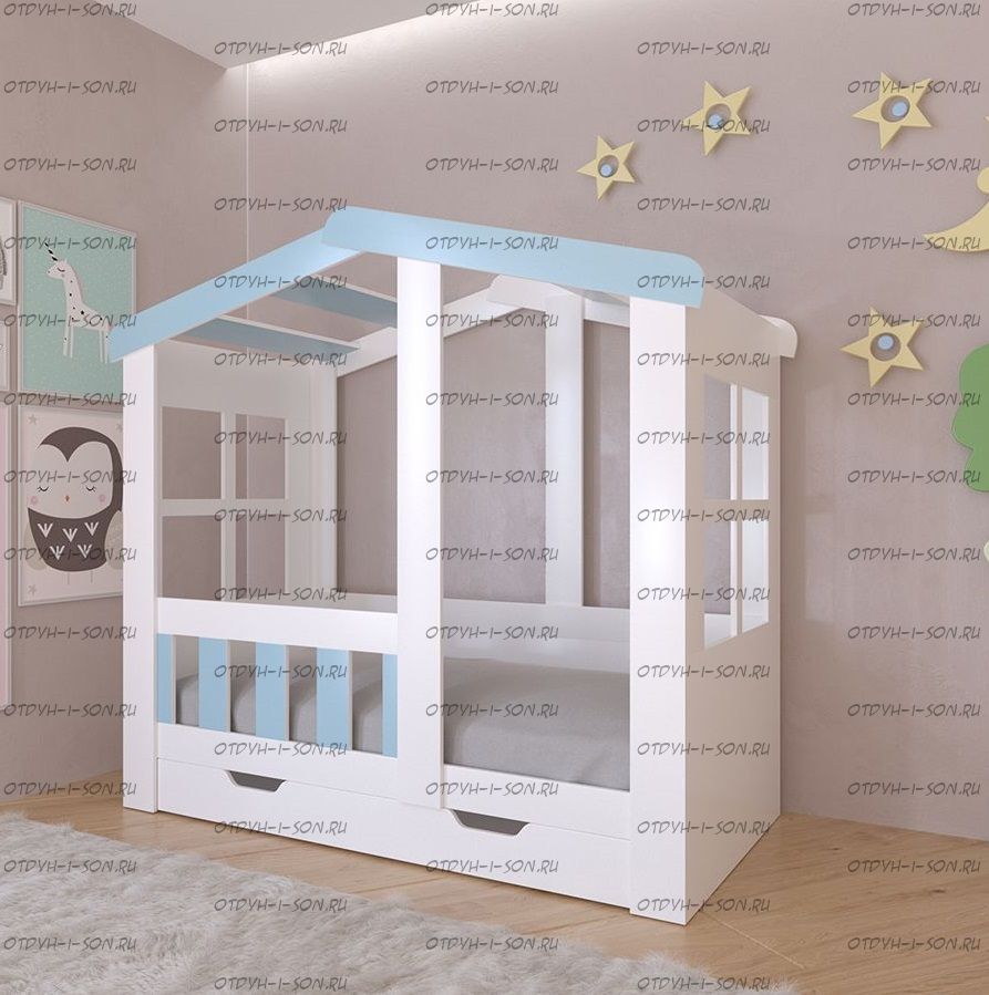 Кровать-Домик со спальным местом 800х1600, снизу которой, для полной функциональности, добавлены один ящик с двумя отделениями куда можно поместить мелочи, игрушки и прочих вещи. Важной особенностью данной модели является крыша, что позволит ребенку играть и чувствовать себя по настоящему счастливым в "своем" домике, мире.