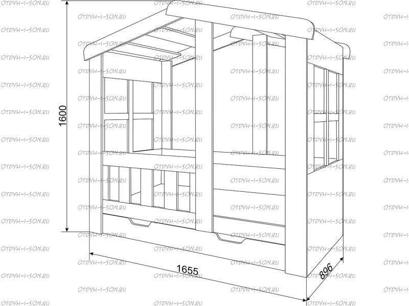 Кровать-Домик Характеристики: Спальное место: 80х160 см Внешние габариты: Ш1650хГ896хВ1600 мм Материал: ЛДСП (ДСП класса Е1), фурнитура, все лицевые кромки покрыты ПВХ Гарантия производителя – 12 мес. Максимальная нагрузка при интенсивной эксплуатации (с учётом матраса) – 80 кг Универсальная сборка, при необходимости собирается как в левую, так и в правую стороны т.е. расположение элементов мебели определяется при сборке Дно кровати – лист ДСП 16 мм Кровать-Домик со спальным местом 800х1600, снизу которой, для полной функциональности, добавлены один ящик с двумя отделениями куда можно поместить мелочи, игрушки и прочих вещи. Важной особенностью данной модели является крыша, что позволит ребенку играть и чувствовать себя по настоящему счастливым в "своем" домике, мире. Чтобы модель была безопасной, лицевые кромки обработаны ПВХ 2 мм и подобраны в тон корпуса, в некоторых местах кромка составляет 0,4мм. Не обрабатываются те стороны, которые примыкают к другим панелям. Максимальная нагрузка 80 кг. Астра 9.1 собирается как на картинке или можно собрать в зеркальном отражении. Это одна из самых популярных моделей из серии кроватей Домик по разумной цене, что немаловажно для заботливых родителей.