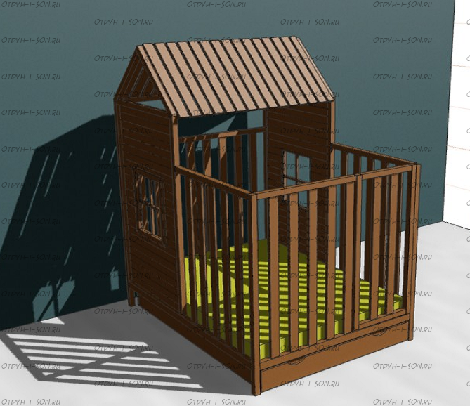 Также возможно использование одного или обоих спальных мест для детей от года, в таком случае бортики кровати просто увеличиваются по высоте. При изготовлении кровати Домика углового используются только экологически чистые материалы, эмали, лаки и краски.