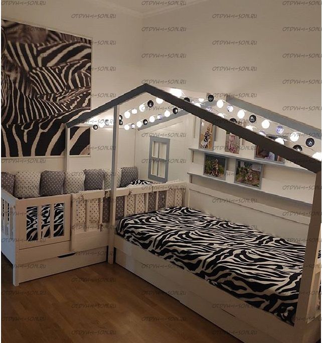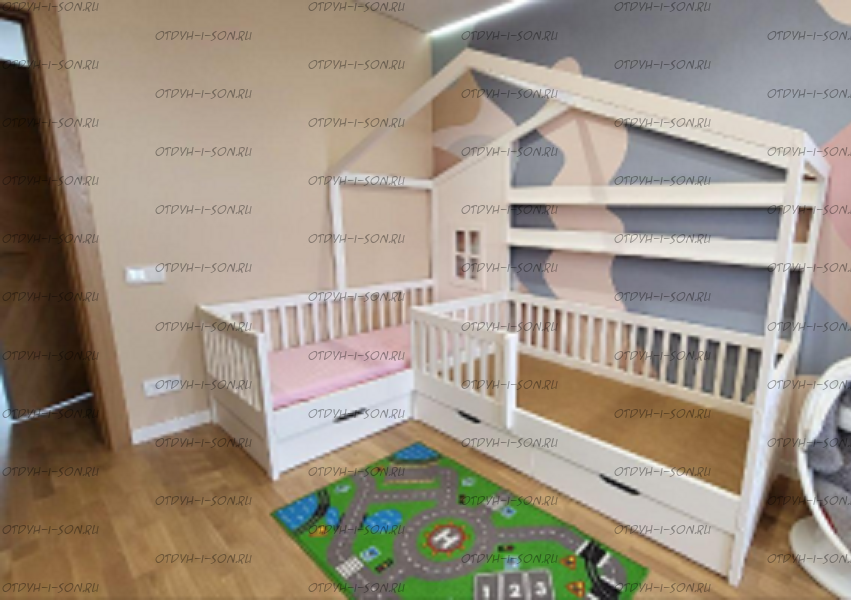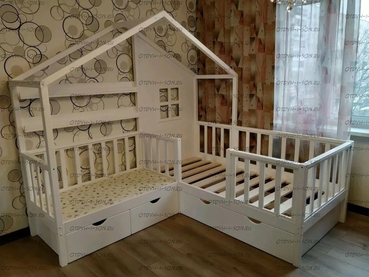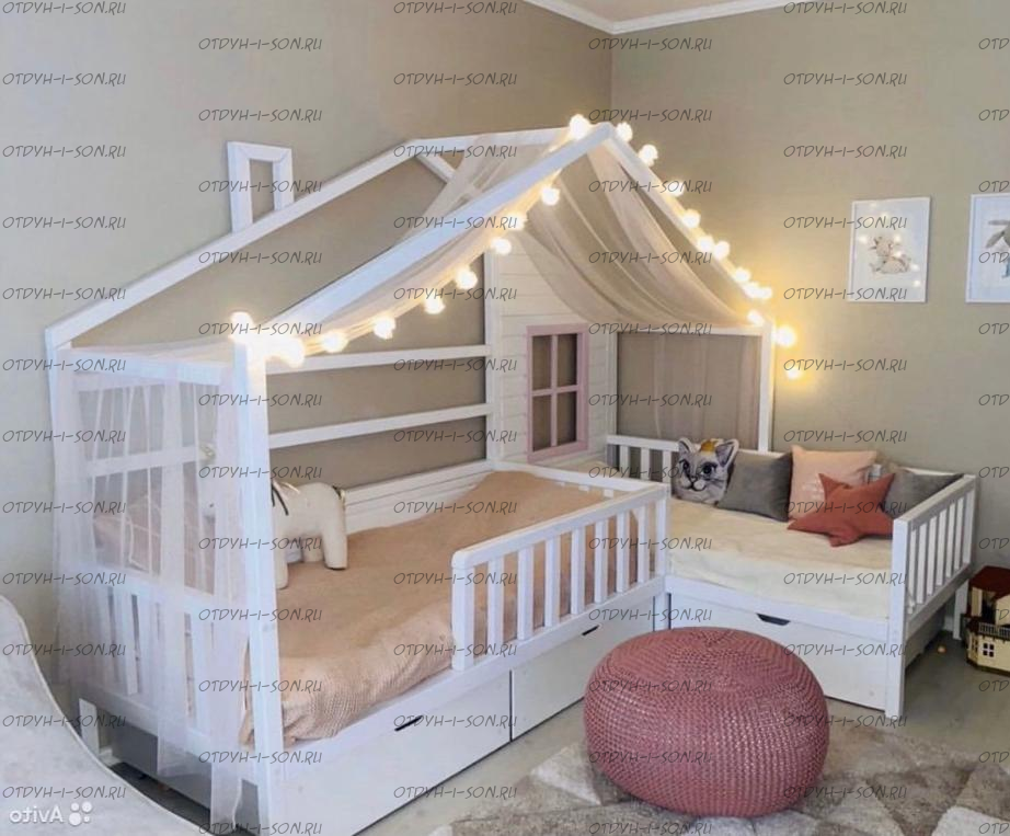 Кровать Домик угловой Fairy Land №18А (для двоих детей) может быть изготовлена с кроватью для новорожденного, а также в любых размерах и цветах.