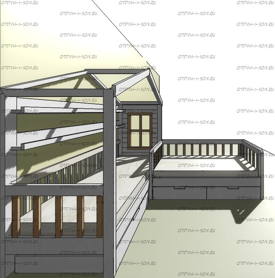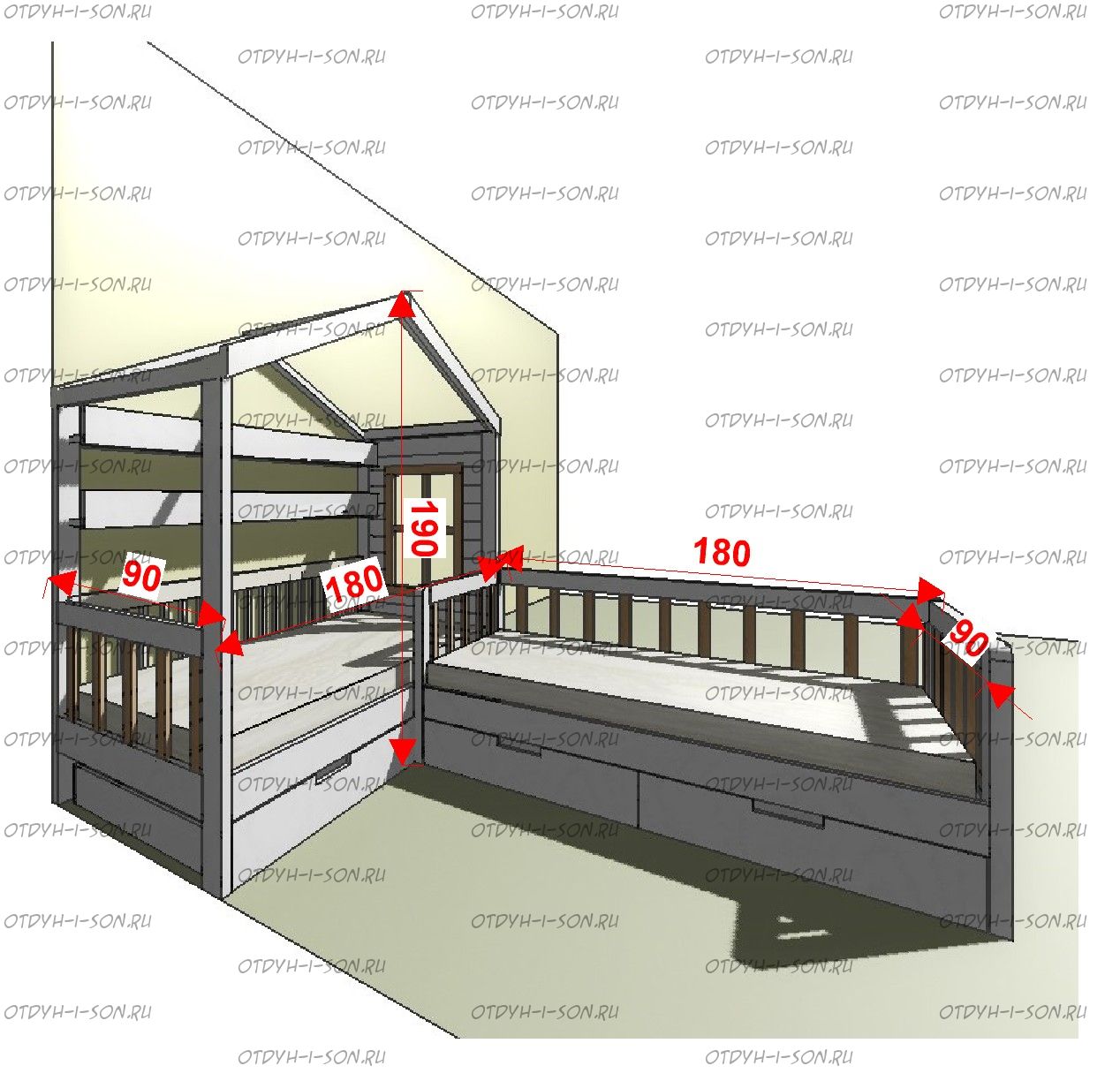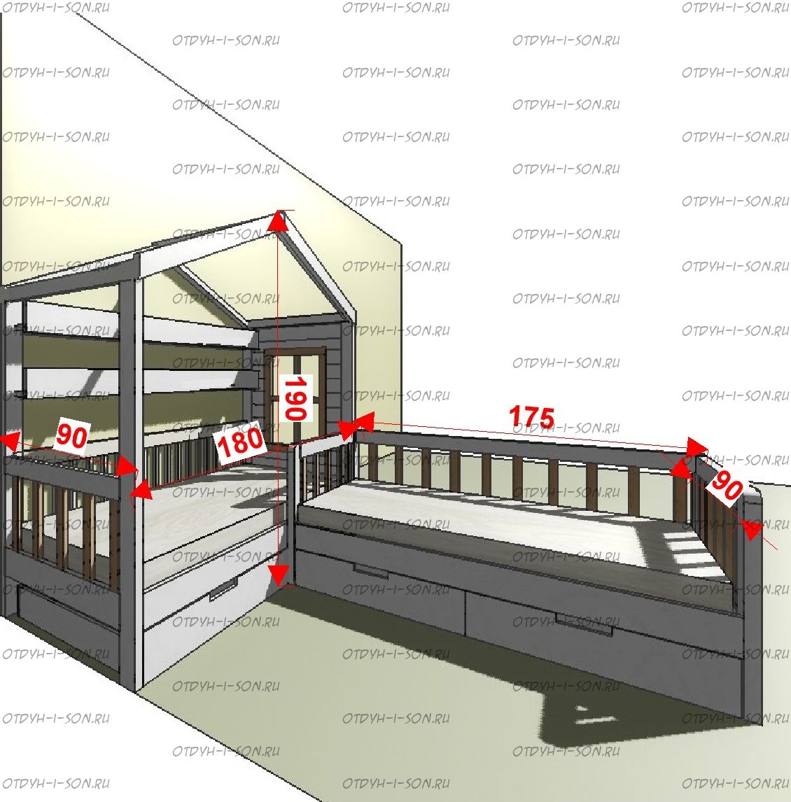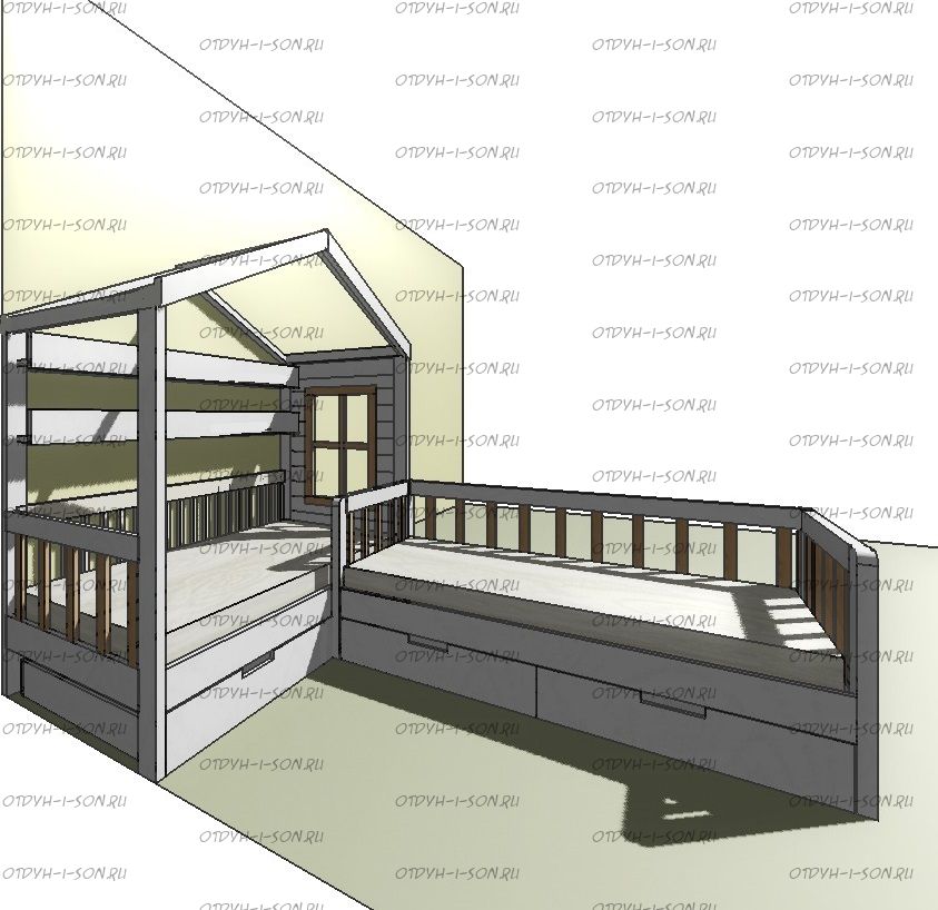 | Размеры изделия | Угловые домики по длинной стороне имеют следующие размеры: сумма длины и ширины двух спальных мест + 15 см. В случае ограниченного пространства в комнате просьба не считатьразмеры самостоятельно, а обратиться к нашим операторам. |