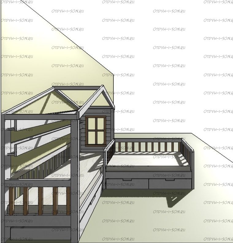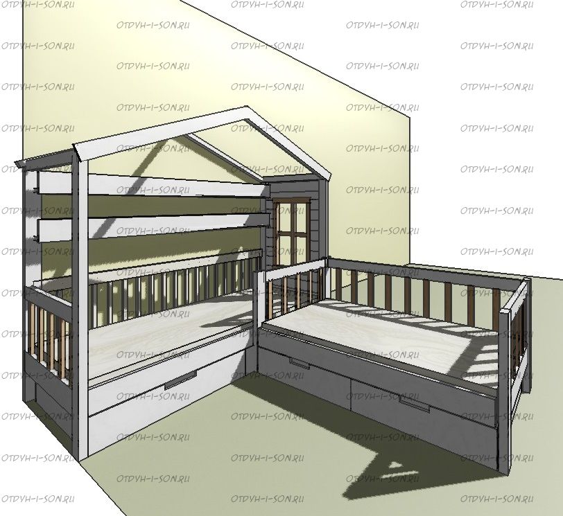 Кровать Домик угловой Fairy Land №32WQ (для двоих детей) может быть изготовлена с кроватью для новорожденного, а также в любых размерах и цветах.