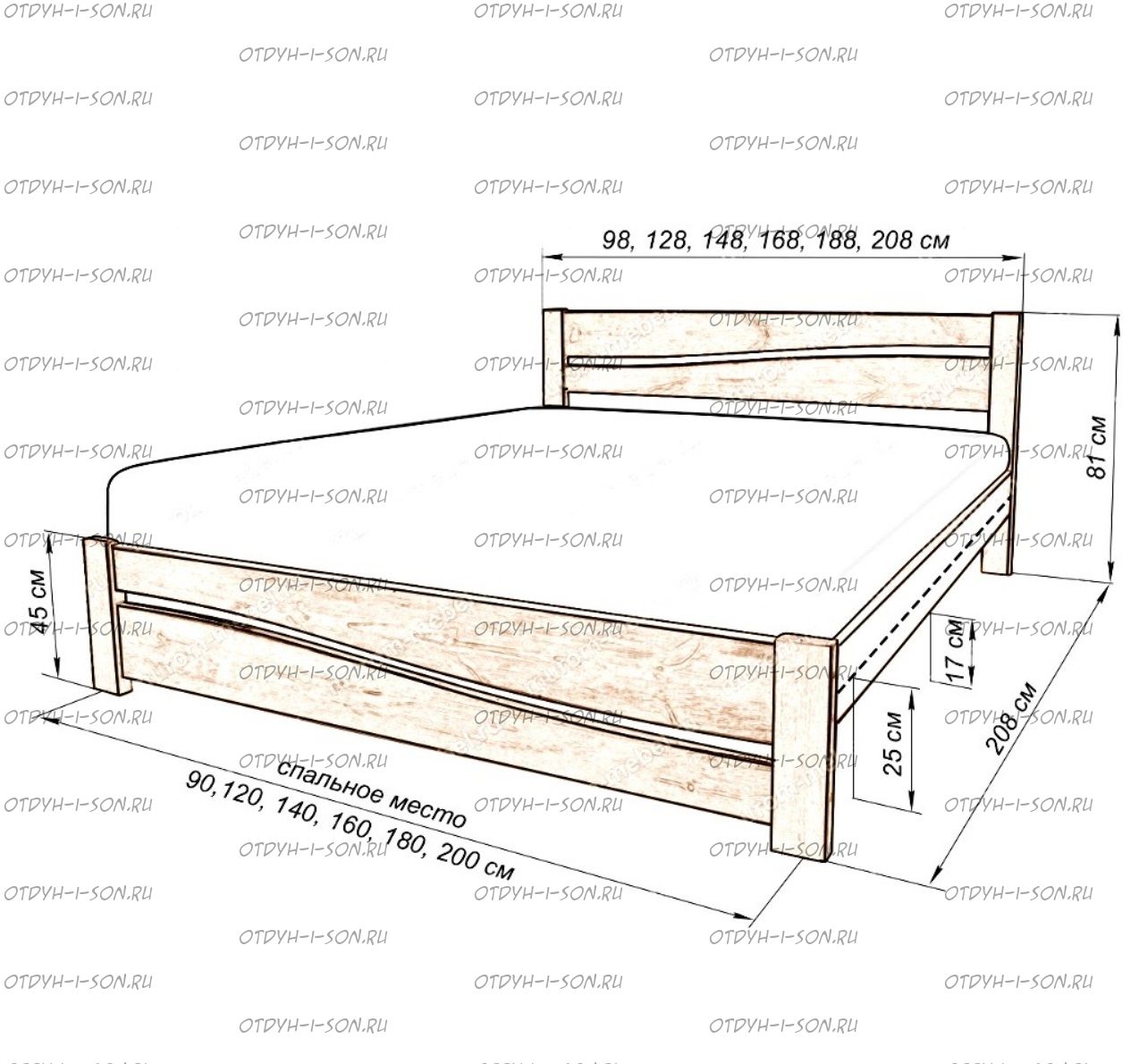 Кровать Карина Характеристики: Размер спального места: 80х190/195/200, 90х190/195/200, 120х190/195/200, 140х190/195/200, 160х190/195/200 см. Комбинированная кровать: Массив сосны и вставки из экологически чистой мебельной фанеры Спинка в изголовье имеет резные элементы с художественной резьбой Габариты кроватей: Высота днища кроватей: Высота от пола до спального места: 25 см. Высота от пола до царги: 19 см. Ширина царги - 16 см., из них 10 см. составляет бортик, который держит матрас, остальные 6 см. под спальным местом, закрывают собой фурнитуру Основание кровати: да, в комплекте Подкроватные ящики: за дополнительную плату Ящики изготавливаются на колесиках и не прикрепляются к кровати, поэтому могут устанавливаться "лицом" к любой из боковыйх сторон кровати. Высота спинки в изголовье кровати: Крепления кровати: В базовом варианте с тыльной стороны ящиков декоративной планки не предусмотрено. Вес: 45-60кг. Любые размеры, в том числе и нестандартные Цвет: венге 1, венге 2, венге 3, венге 4, венге тон 2, коричневый тон 2, коричневый 1, коричневый 2, коричневый 3, коричневый 4, красно-коричневый тон 2, красно-коричневый 1, красно-коричневый 2, красно-коричневый 3, красно-коричневый 4, лак Изготовление из массива березы плюс 30% Изготовление в белом цвете или слоновая кость плюс 20%